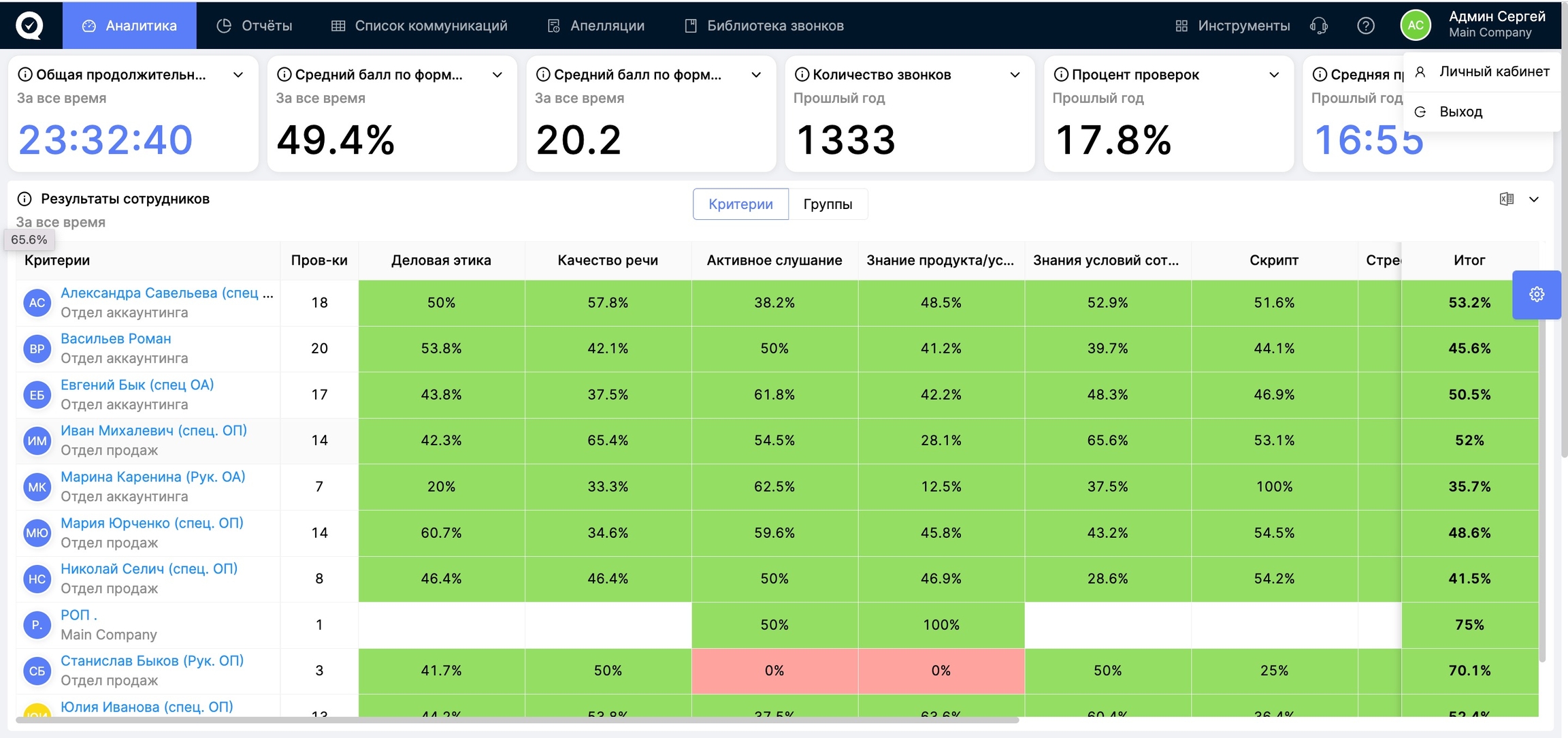 Отдельно хотим выделить отчёт "Команда" - с этой страницы можно перейти в личный кабинет любого оператора и посмотреть, как все выглядит для оцениваемого сотрудника.