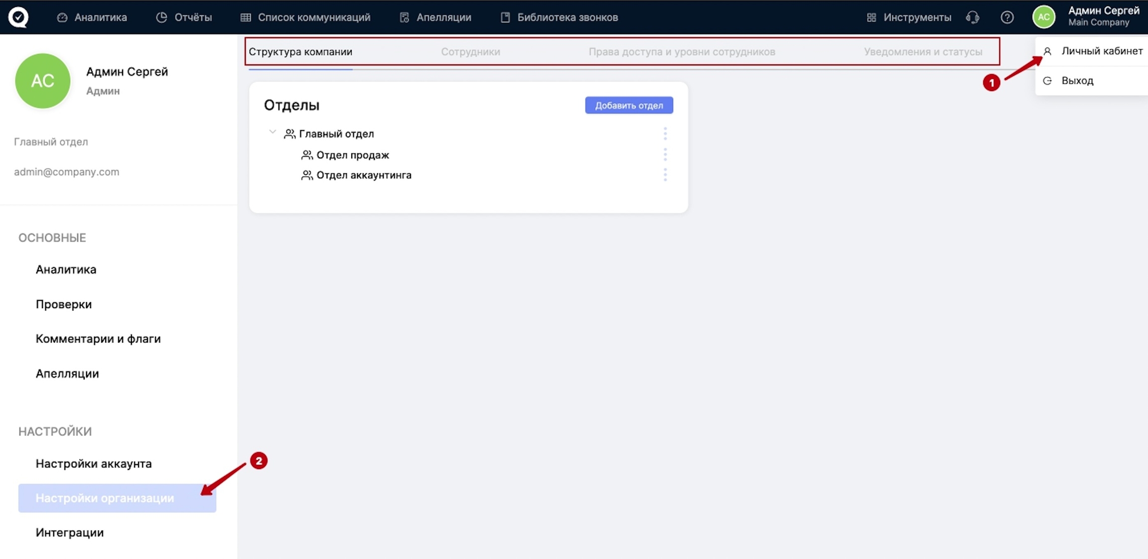 Переключаясь по вкладкам "Структура компании", "Сотрудники", "Права доступа и уровни сотрудников" вы найдёте всевозможные настройки.