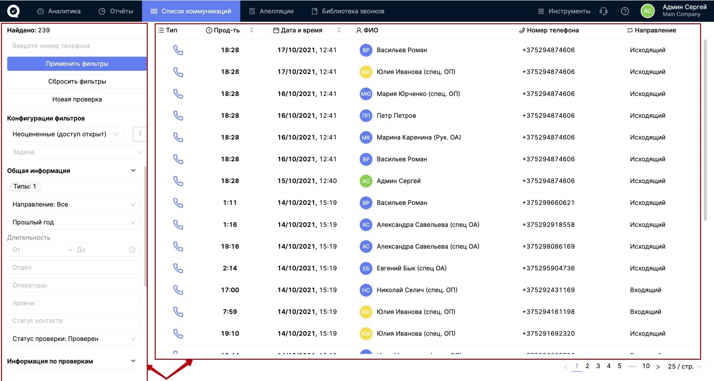 1. Список коммуникаций. Страница состоит из двух зон: фильтры (слева) и таблица коммуникаций (справа). В зависимости от настроенных фильтров слева, в таблице справа будут отображаться коммуникации по заданным параметрам. Для того, чтобы совершить оценку коммуникации, необходимо кликнуть по синей иконке в столбце "Тип".
