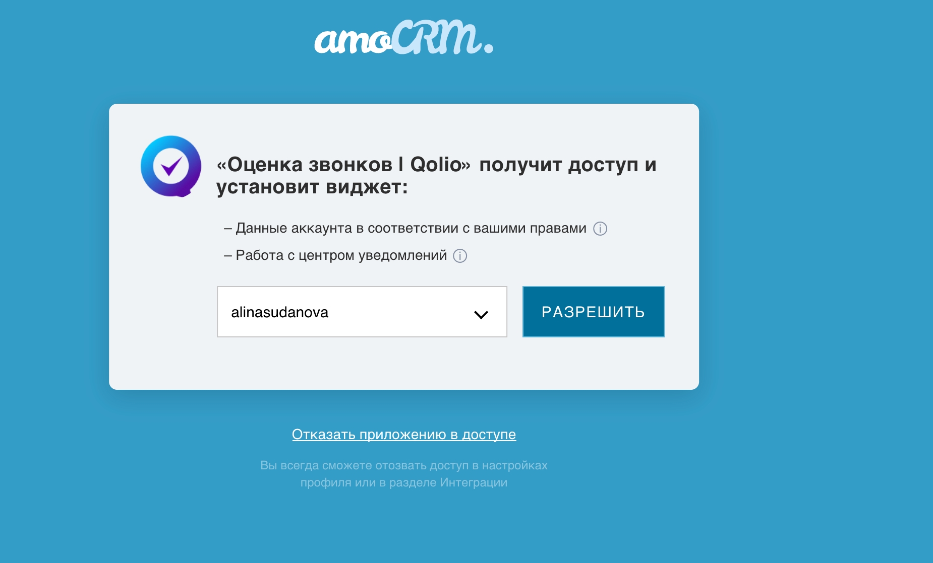 После успешной установки виджета Qolio в аккаунте amoCRM, вы получите уведомление на электронную почту, с которой Вы авторизовались в системе. Пожалуйста, проверьте свою почту, чтобы завершить регистрацию и начать использовать все возможности, которые предоставляет Qolio для анализа взаимодействий с клиентами.
