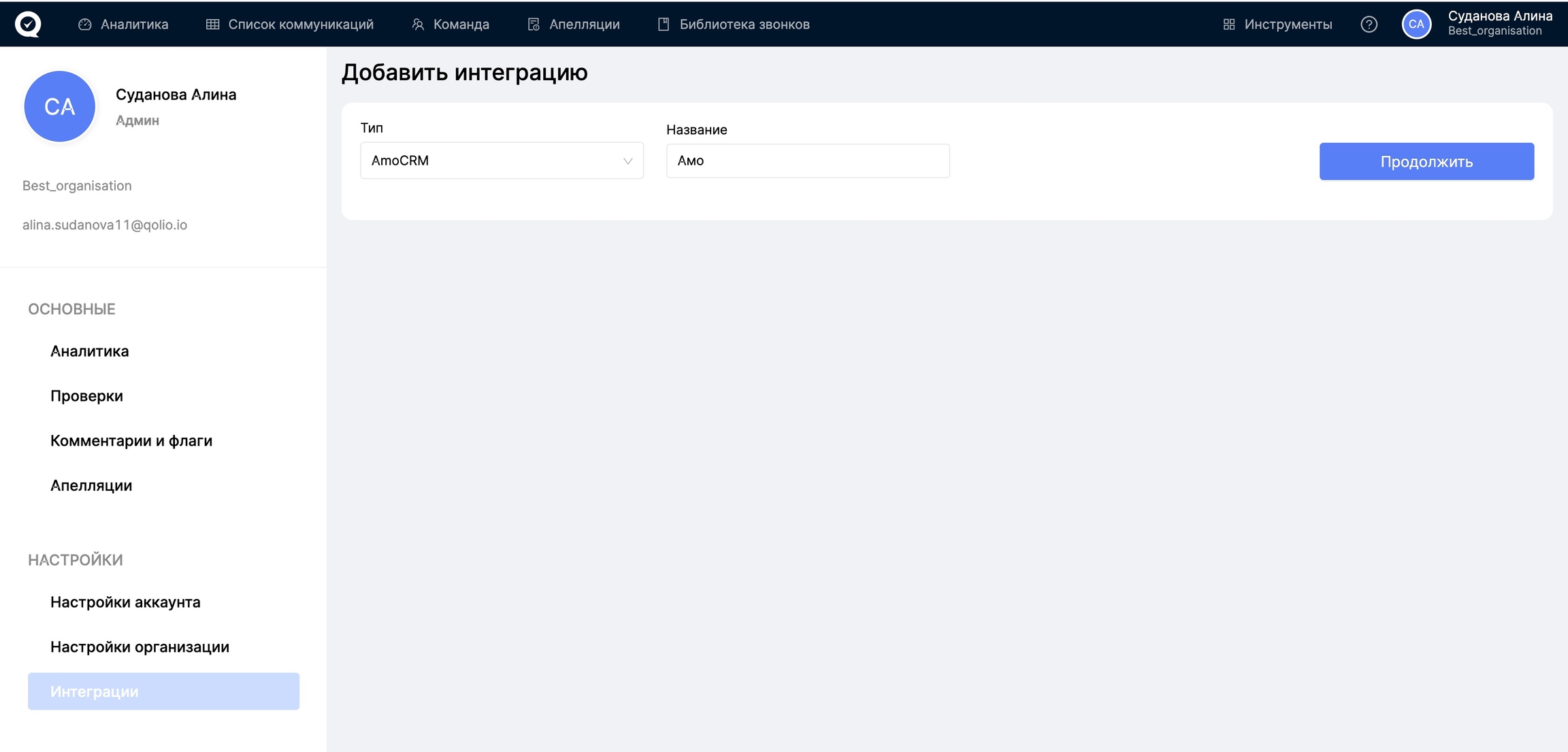 Установка интеграции AmoCRM через уже существующую организацию в Qolio