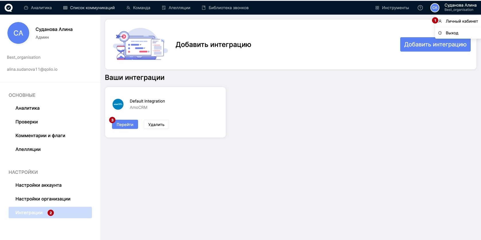 Если у вас уже создана организация в Qolio, и вы хотите дополнительно подключить интеграцию с AmoCRM, перейдите в личный кабинет на вкладку Интеграции и нажмите на кнопку Добавить интеграцию.