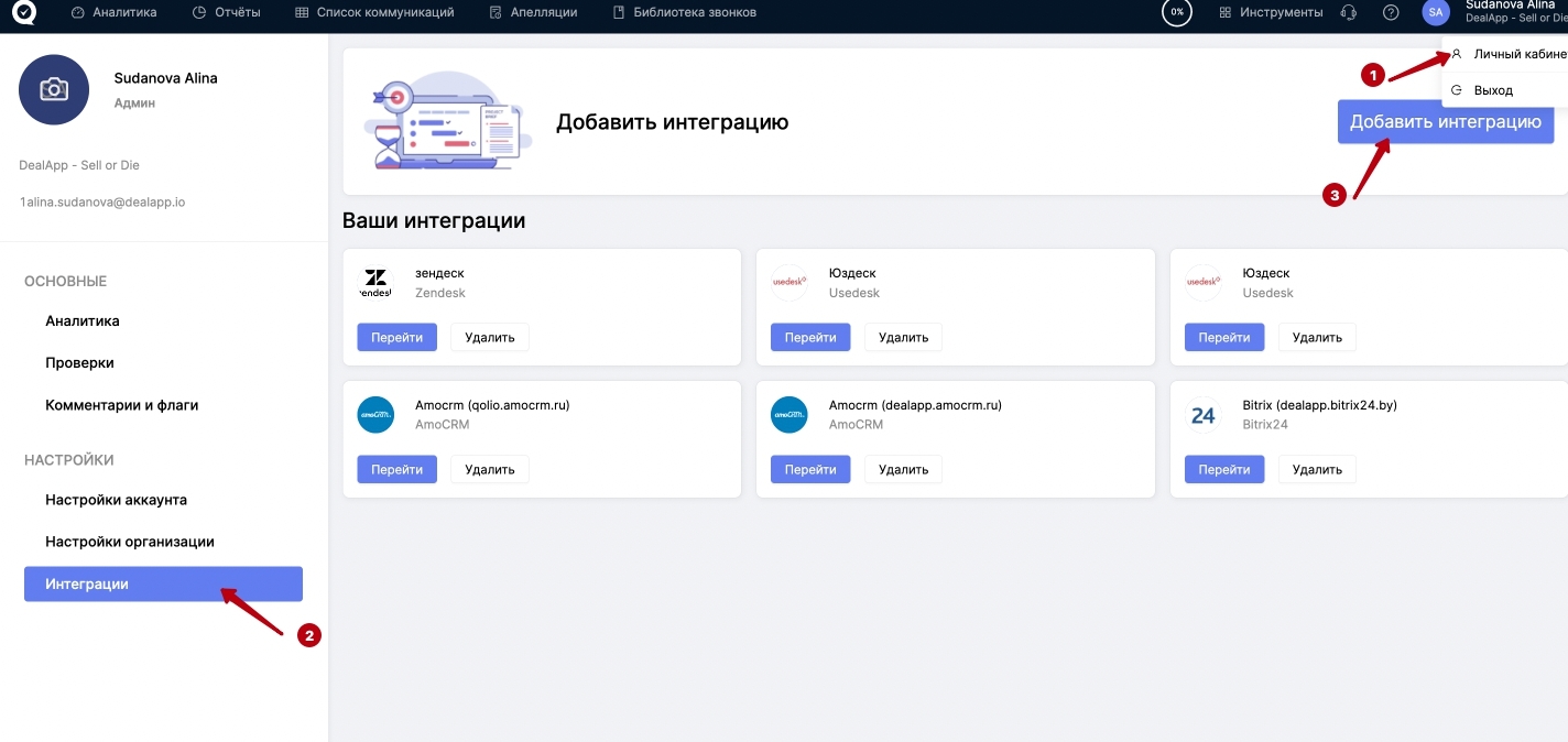 Если у вас еще нет кабинета в Qolio, обратитесь к нам в чат справа снизу для его создания. Если у вас уже есть Qolio, перейдите в личный кабинет -> Интеграции и нажмите на "Добавить интеграцию". Из списка интеграций выберите тип "Binotel", напишите любое название для вашей интеграции. Далее в поле Client ID вставьте информацию key, которую вам прислал Binotel, а в поле Client Secret - secret. Если при нажатии на кнопку Сохранить у вас возникла ошибка, проверьте правильность введенных данных или уточните у поддержки Binotel их корректность.