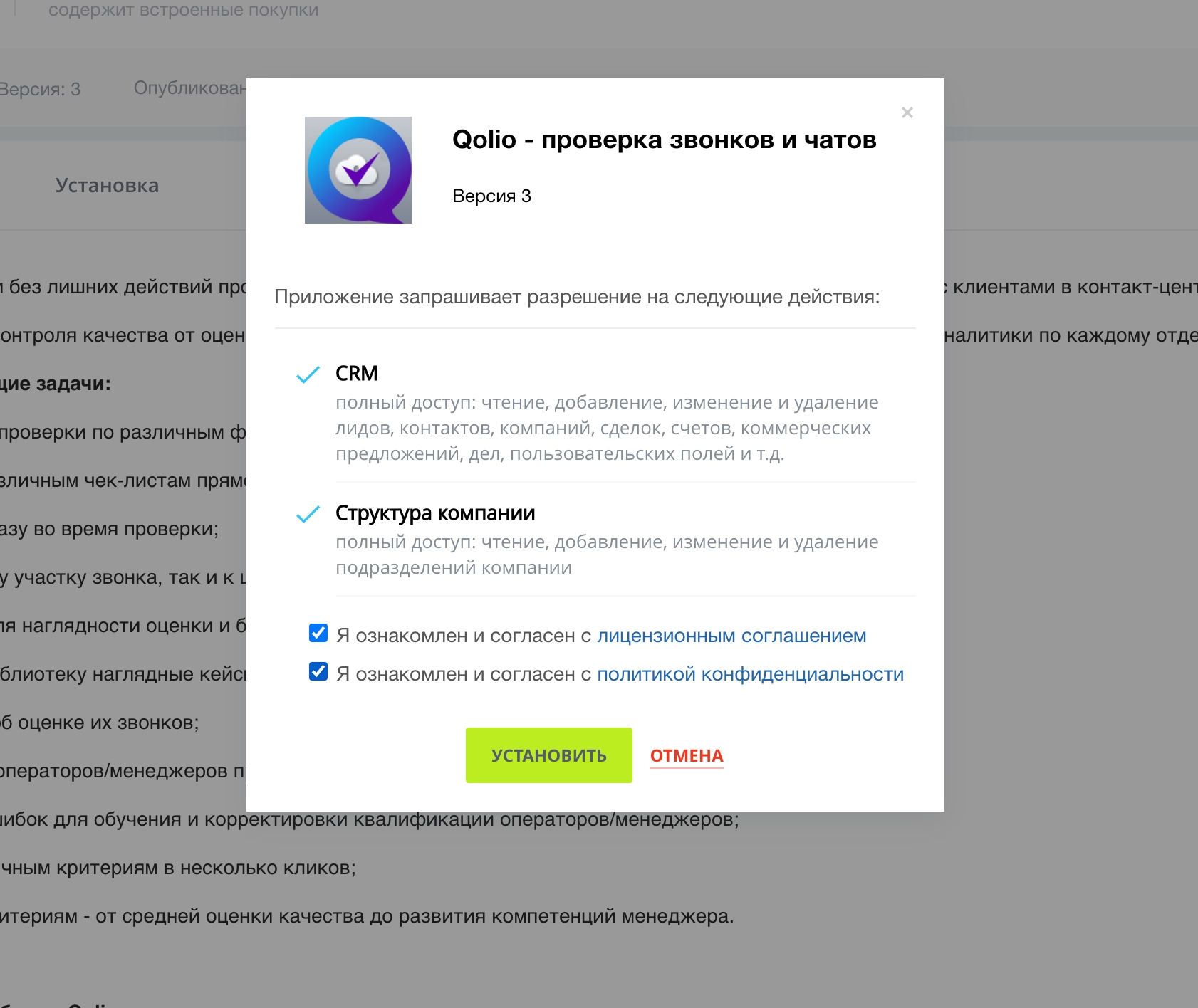 ❗️Важно: Приложение Qolio выполняет только чтение информации о карточке (лида или сделки) для того, чтобы отображать информацию для проверки во вкладке карточки и отображать дополнительную информацию по коммуникации в самом приложении.