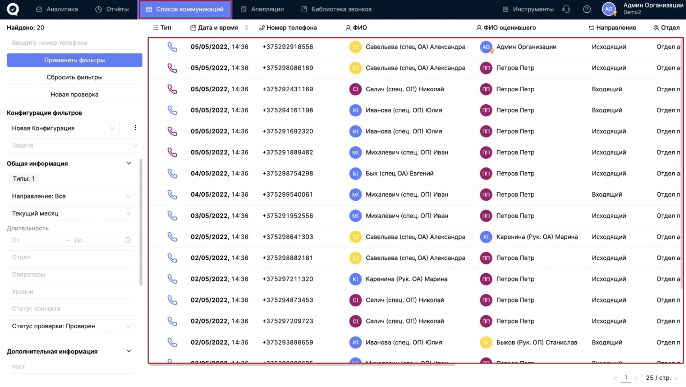 Перейдите на вкладку верхнего меню "Список коммуникаций" и убедитесь, что там есть звонки.