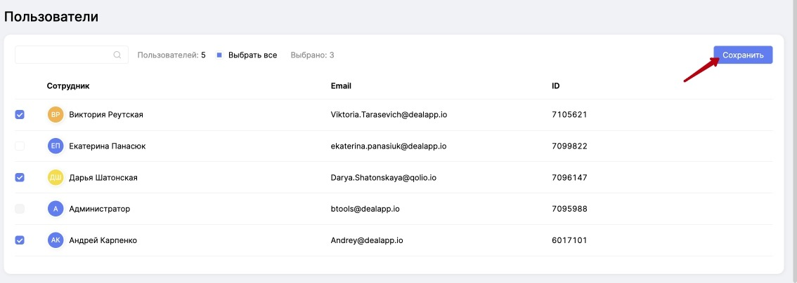Интеграции -> перейдите в вашу интеграцию и проверьте, отмечены ли галочками в разделе "Пользователи" ваши сотрудники. Если никто не отмечен, тогда мы нашли причину отсутствия звонков. Отметьте галочками тех сотрудников, которых хотите добавить в Qolio и нажмите на кнопку "Сохранить". После этого, запустите синхронизацию звонков за тот период, который вам нужен.