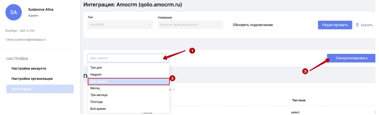 Выбор периода и запуск синхронизации