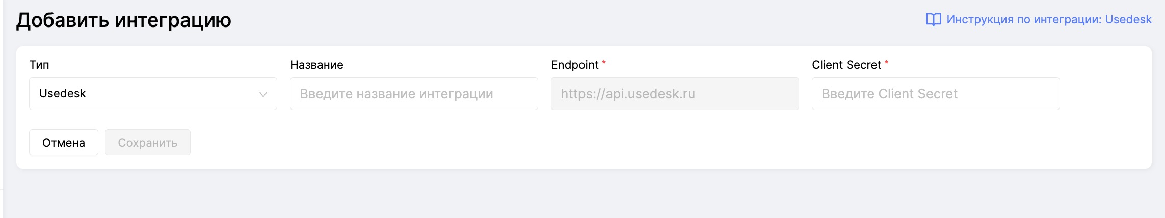 Далее выберите тип интеграции "Usedesk", напишите название для вашей интеграции и заполните поле "Client Secret"