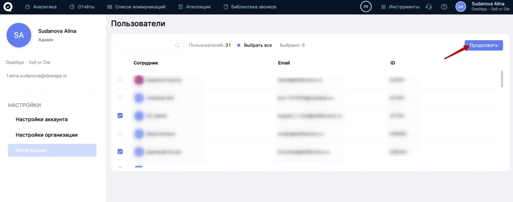 Далее будут импортированы пользователи из вашего Usedesk. Чем больше пользователей, тем больше времени понадобится, чтобы импортировать данные. Как только импорт завершится, вы увидите список пользователей. Галочками отметьте тех, кого вы хотите добавить в Qolio. Отметить нужно операторов, сотрудников контроля качества и других сотрудников , которые будут работать в Qolio. После того, как отметите всех, кого нужно, нажмите на кнопку "Продолжить".