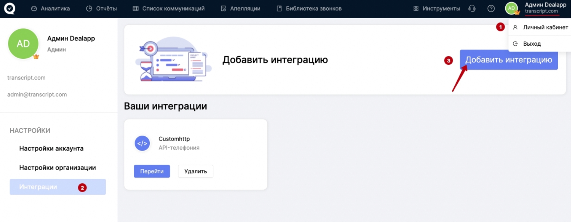 Для того, чтобы установить интеграцию Usedesk, перейдите в личном кабинете в раздел "Интеграции" и нажмите на кнопку "Добавить интеграцию".