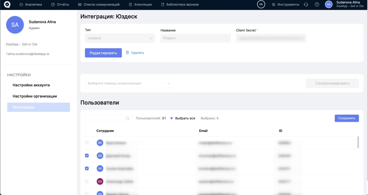 ❗️ Обращаем внимание, что если у вас в Usedesk появятся новые сотрудники, то, для того, чтобы они появились в Qolio, необходимо запустить синхронизацию за три дня. После этого новые сотрудники появятся в разделе "Пользователи". Нужно будет отметить новых сотрудников галочкой и нажать на синюю кнопку "Сохранить" справа.