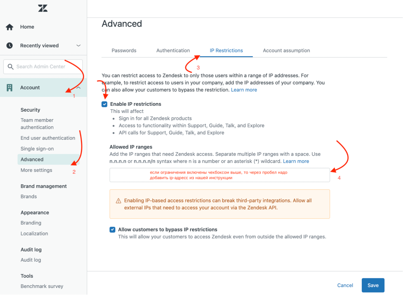Если установлено ограничение по IP необходимо перед запуском интеграции добавить ip адрес 84.201.174.102 в список разрешенных. Инструкция как проверить: Restricting access to Zendesk Support and your Help Center using IP restrictions