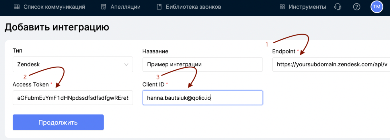 Для создания интеграции в Qolio необходимо 3 значения (Endpoint, Access Token, Client ID):