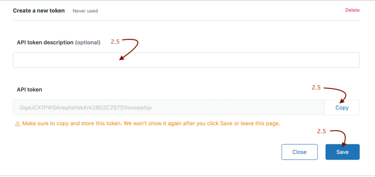 Cначала скопировать сгенерированный токен (кнопка COPY) и только потом нажать Save. Токен окажется в буфере обмена устройства и необходимо его вставить в какой-нибудь файл для дальнейшего хранения и пересылке партнерам. Это важно так как после первого просмотра токен будет невозможно просмотреть, придется создавать новый.