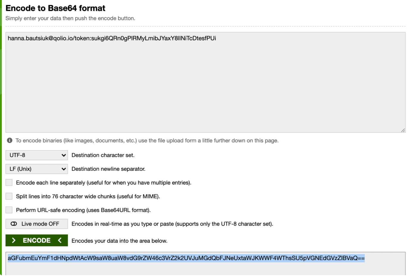 Полученный новый токен необходимо скопировать и использовать для дальнейшего подключения. Новый токен внешне должен быть длиннее предыдущего. Итоговый токен примера (aGFubmEuYmF1dHNpdWtAcW9saW8uaW8vdG9rZW46c3VrZ2k2UVJuMGdQbFJNeUxtaWJKWWF4WThsSU5pVGNEdGVzZlBVaQ==) его и необходимо вставить в поле access_token.