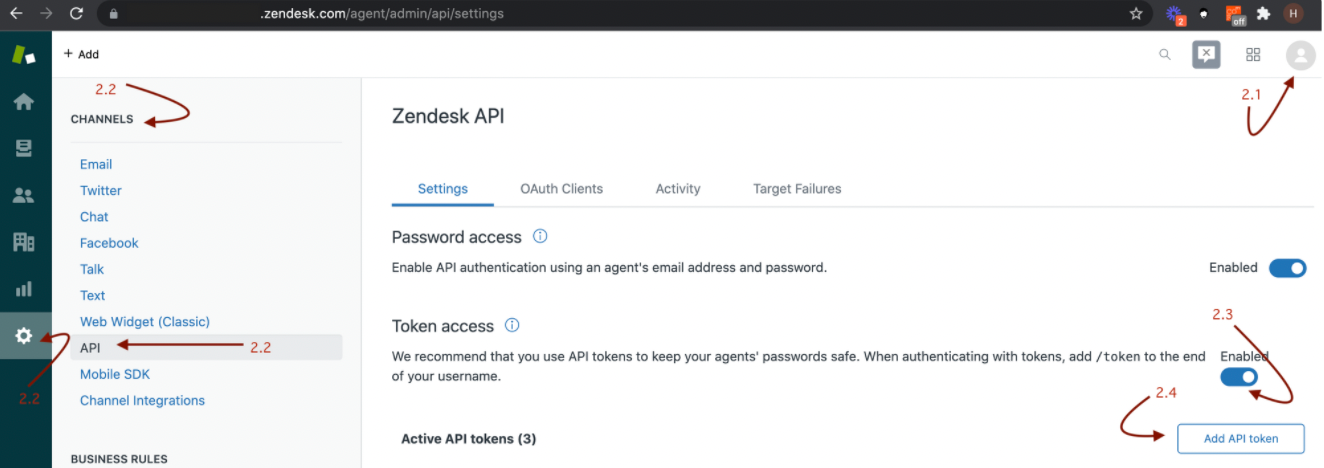 2.1 Войти в кабинет Zendesk (https://yoursubdomain.zendesk.com) под пользователем