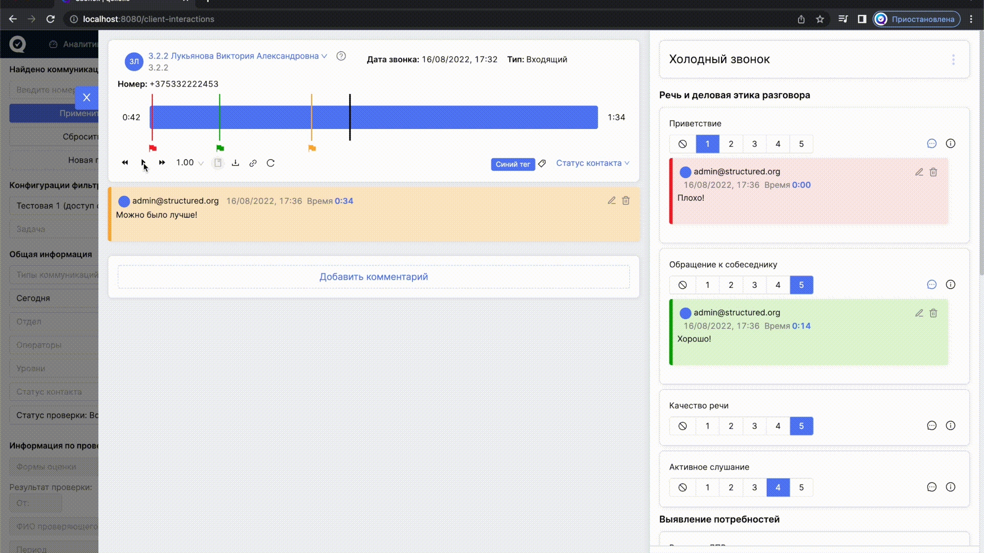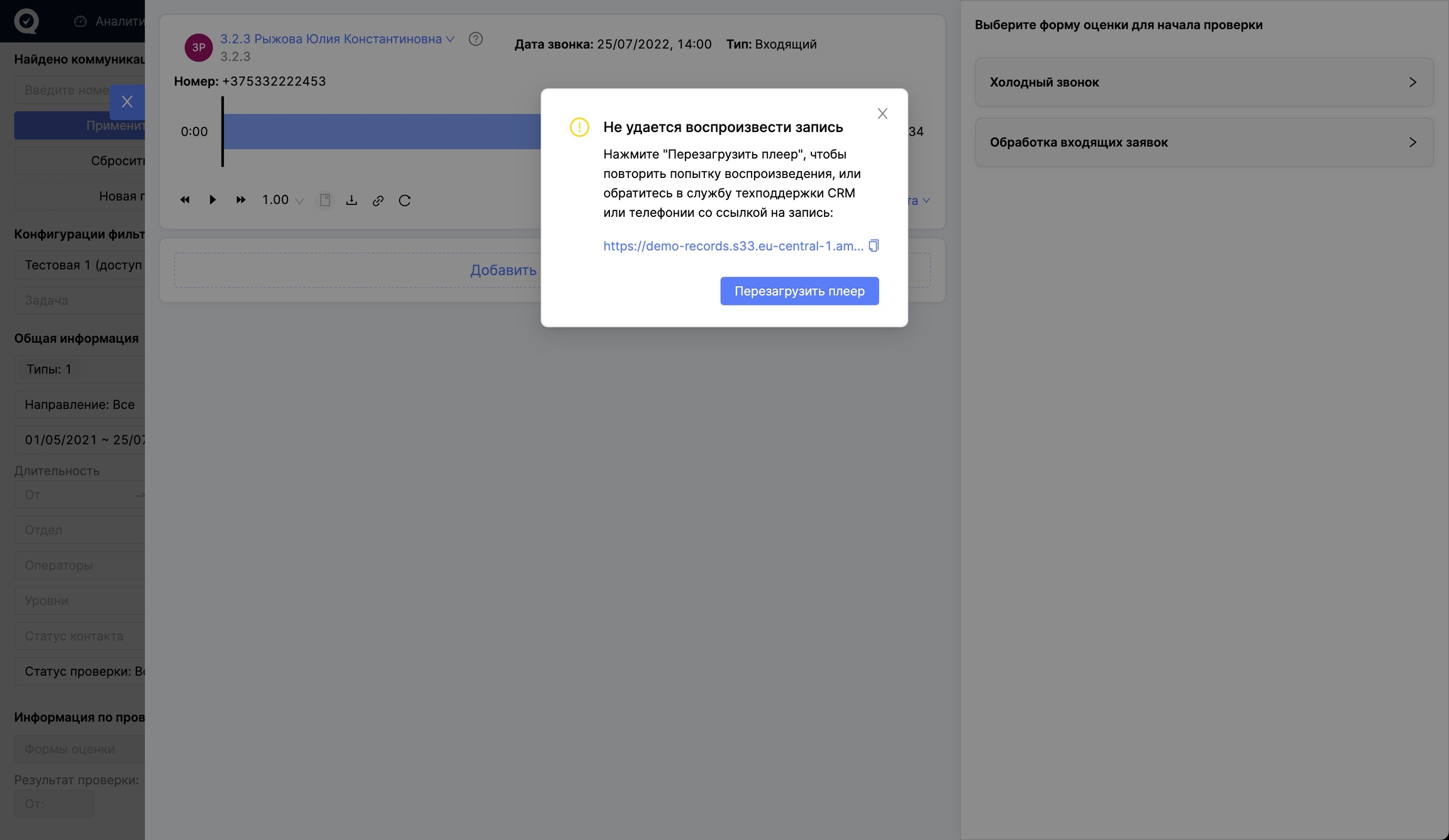 Иногда во время проверки звонка возникает ситуация, в которой тот самый звонок перестает проигрываться. Это может происходить по разным причинам: отключился интернет, закончилось время «жизни» ссылки, или телефония перестала «отдавать» звонок. Что делать в таком случае? Можно перезагрузить страницу, но это повлечет за собой потерю всех данных оценки, которые уже были оставлены. При перезагрузке страницы потеряются комментарии, теги, общий комментарий и баллы формы оценки. Для того, чтобы безболезненно восстановить доступ к записи, мы добавили кнопку перезагрузки плеера.