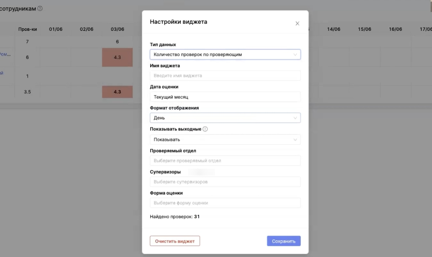 В настройках виджета “Количество проверок по проверяющим” появилась возможность выбирать супервизоров и проверяемые отделы. Раньше вместо этого можно было выбирать операторов.