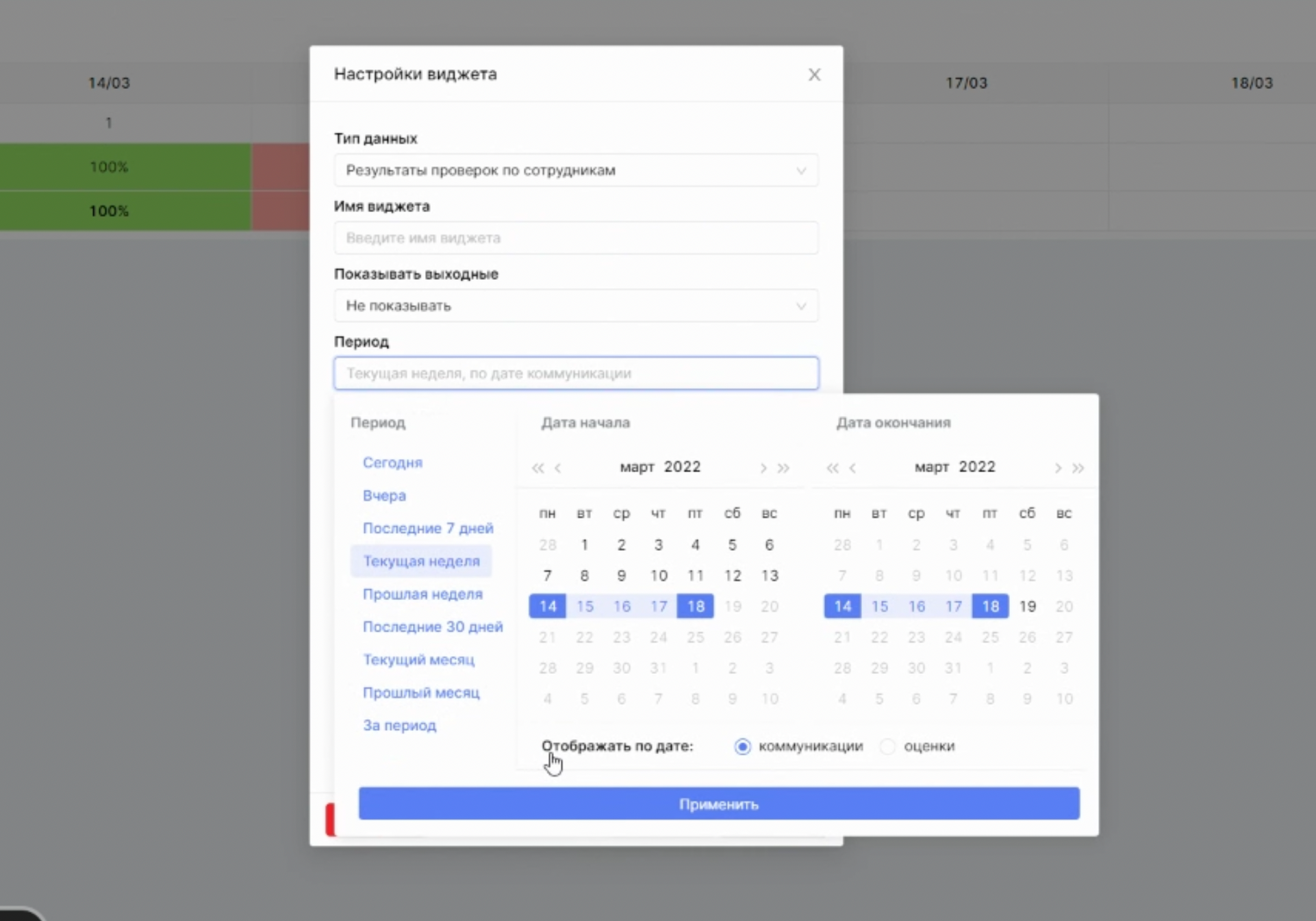 Для того, чтобы посмотреть, как выглядит выбор формата даты, создадим новый виджет "Результаты проверок по сотрудникам". Все поля кроме "Период" (новое название поля "Дата коммуникации") остались неизменными, поэтому остановимся подробнее именно на нем.