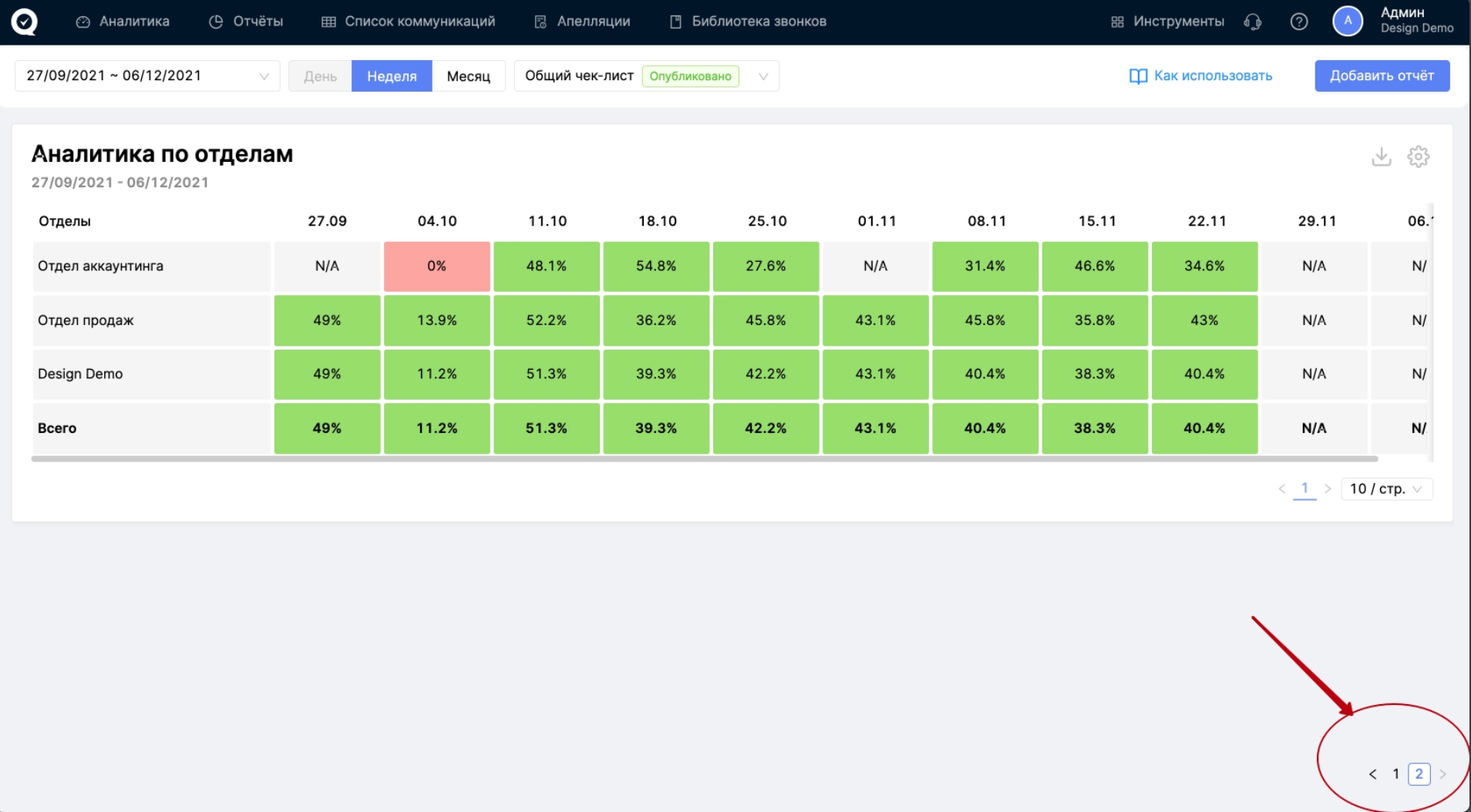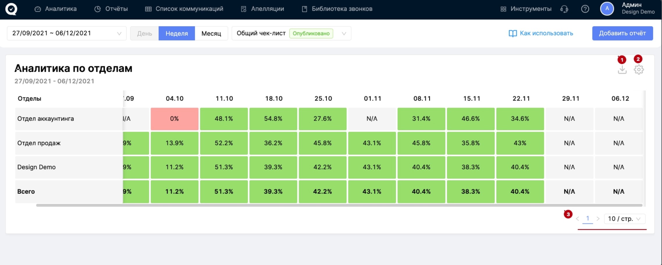 Данный отчёт отображает динамику результатов по отделам. В строках расположены отделы, а в столбцах - даты. Столбец "Всего" показывает общий результат по каждой дате (каждому столбцу). Если в конкретную дату по конкретному отделу не было оценок по коммуникациям, что в такой ячейке будет отображаться N/A.