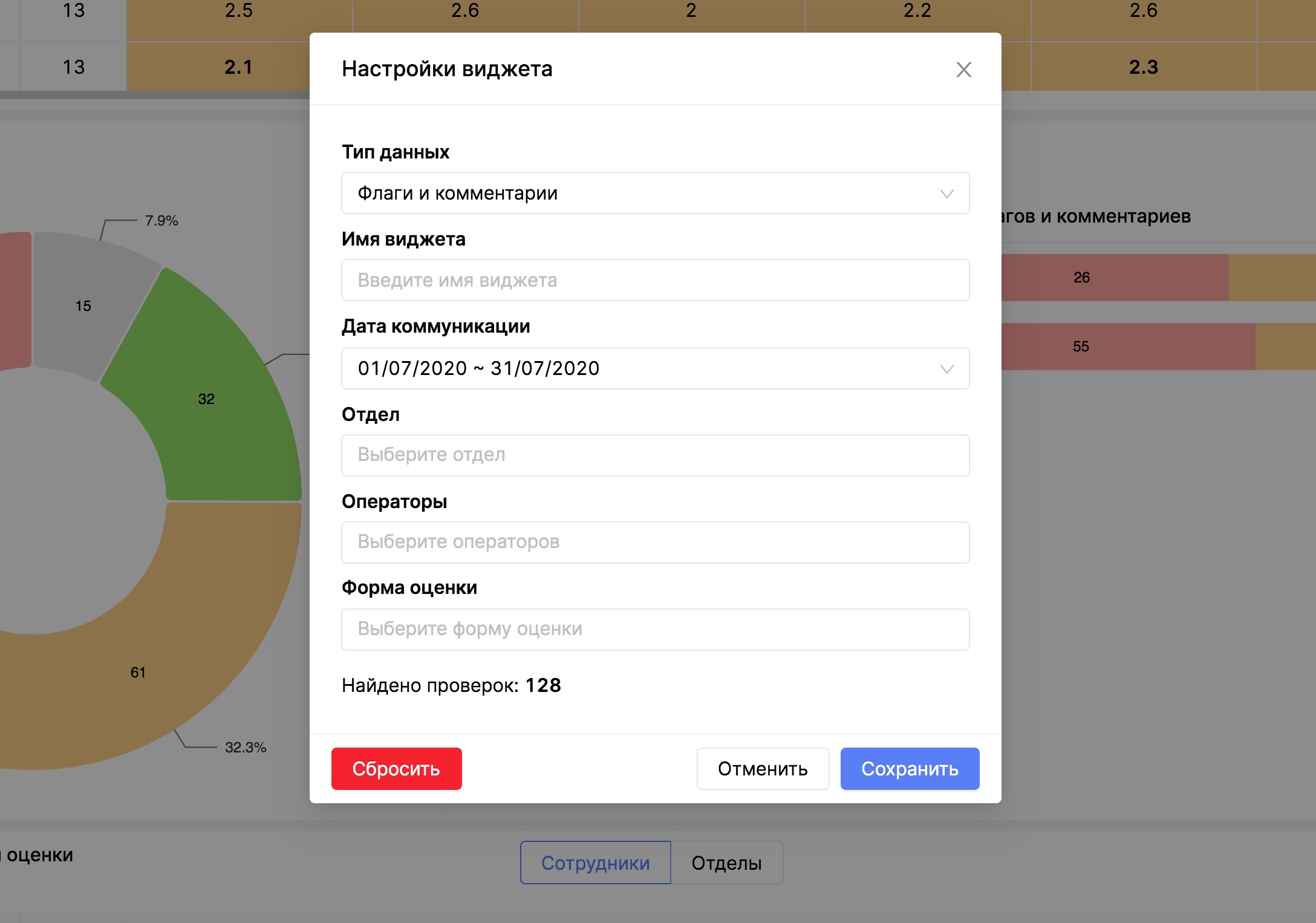 Данный виджет показывает общее количество комментариев, а также соотношение их количества за конкретный временной промежуток / по конкретным операторам / по конкретным формам оценки.