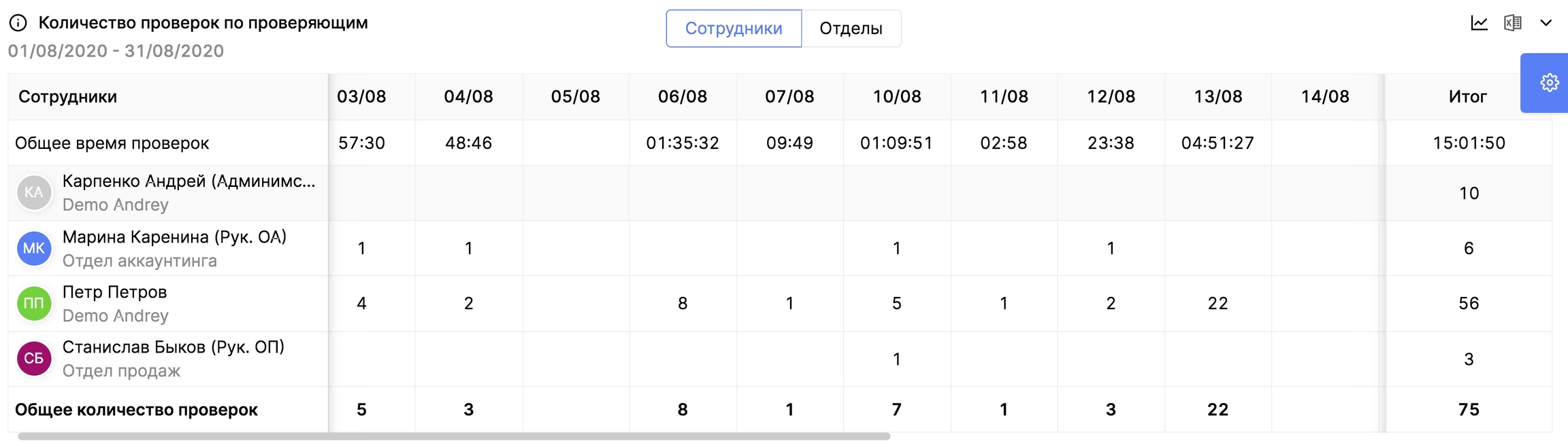 В конкретной ячейке можно увидеть, сколько проверок сделал сотрудник за конкретный день/неделю/месяц/год. Например, супервизор Петр Петров за 06.08 сделала 8 проверок, за 07.08 - 1, а за 13.08 - 22 проверки.