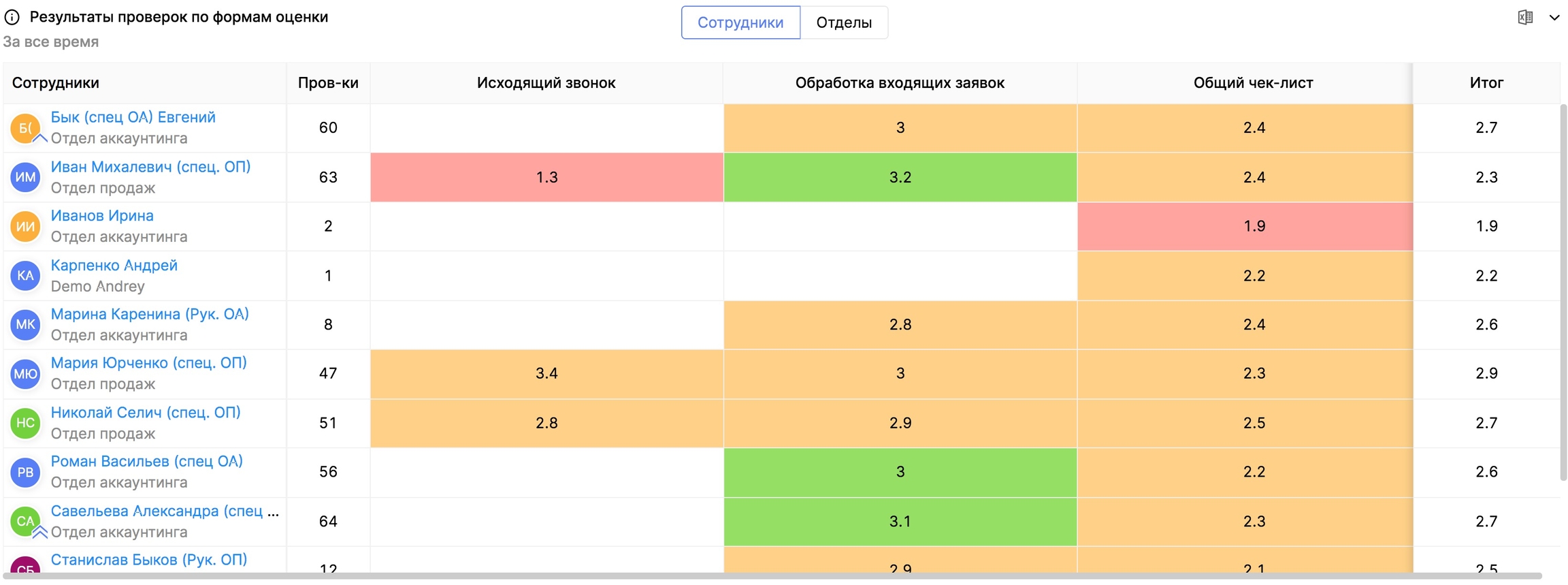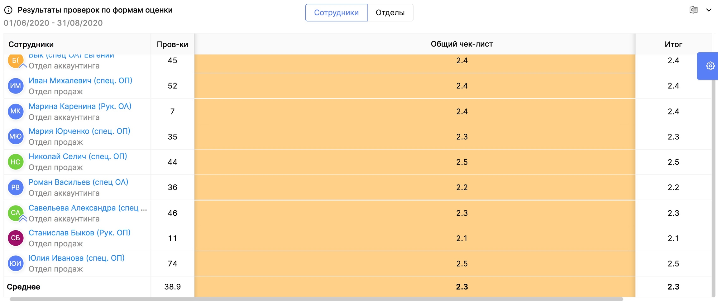 Столбец Проверки показывает общее количество проверок по каждому сотруднику.