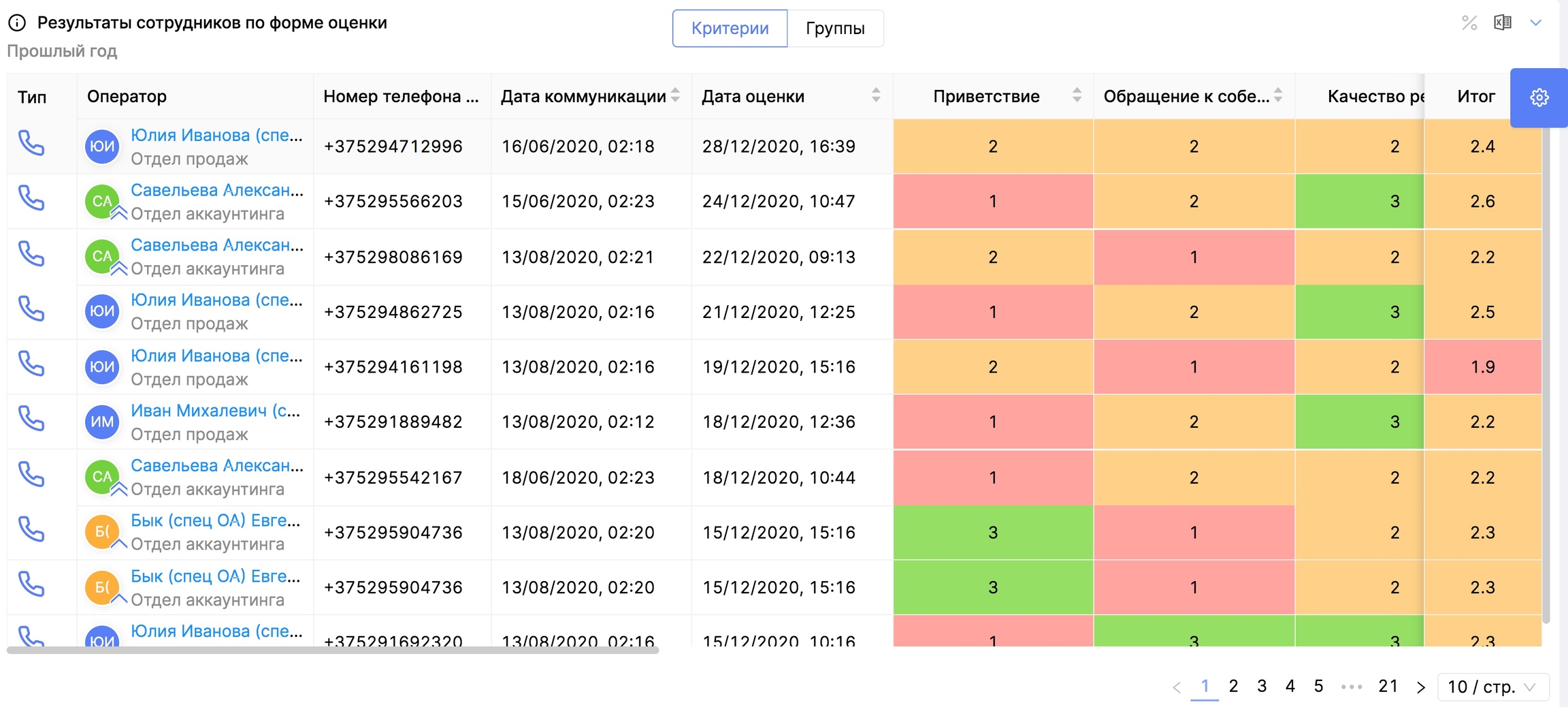 Нажав на иконку телефонной трубки вы сможете увидеть проверку звонка. Аналогично будет с проверками других типов коммуникаций. Кликнув по ФИО оператора вы перейдете в личный кабинет сотрудника.