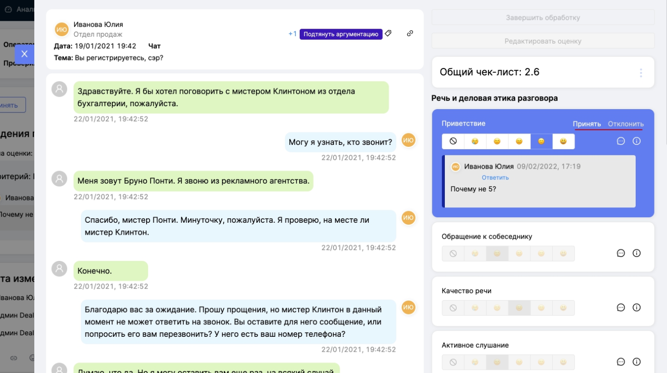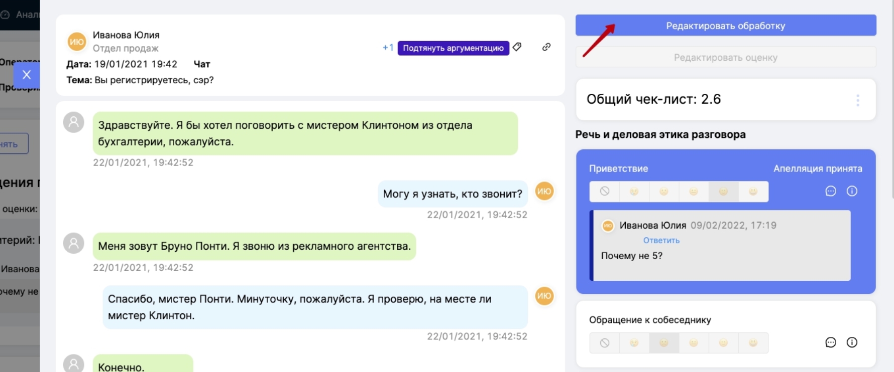 После открытия проверки вы увидите коммуникацию и оценку. Ниже представлен пример обработки апелляции для текстовой коммуникации. Ниже будет показано, как выглядит обработка апелляции, поданной на оценку звонка или на оценку, сделанную через функцию "Новая проверка".