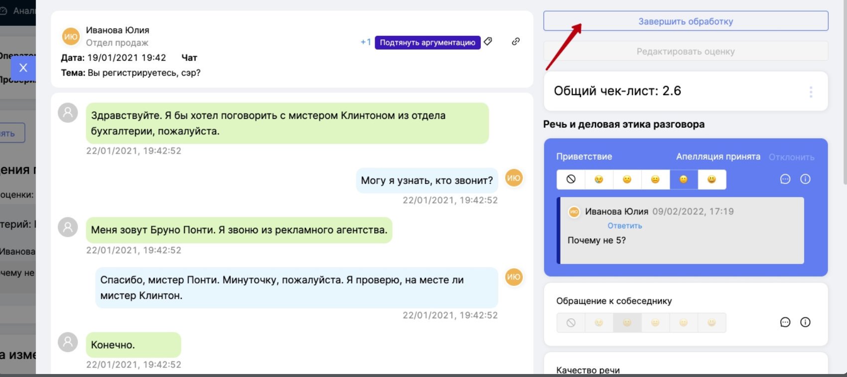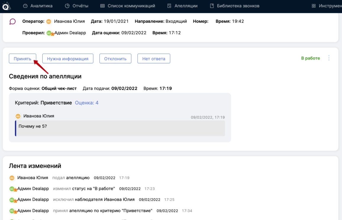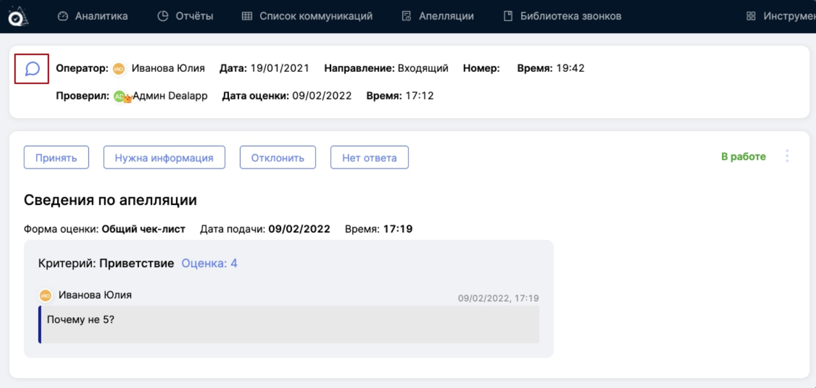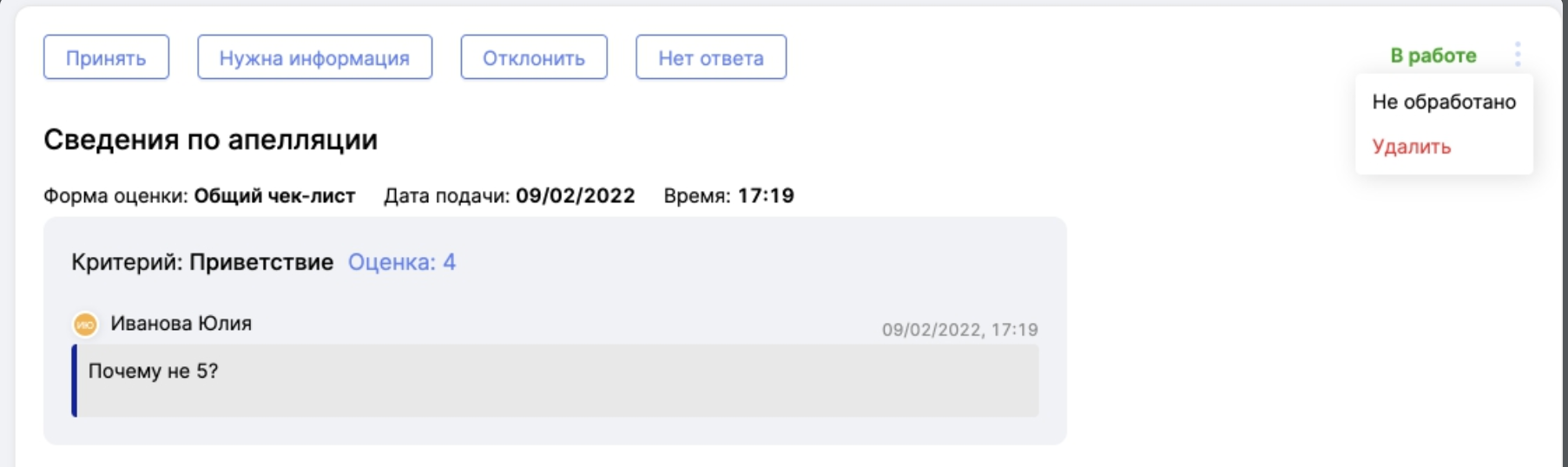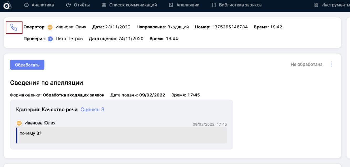 Ниже представлен интерфейс обработки апелляции, поданной на проверку звонка, а также на оценку, совершенную через функцию "Новая проверка". Механизм работы аналогичный, отличается только интерфейс коммуникации.
