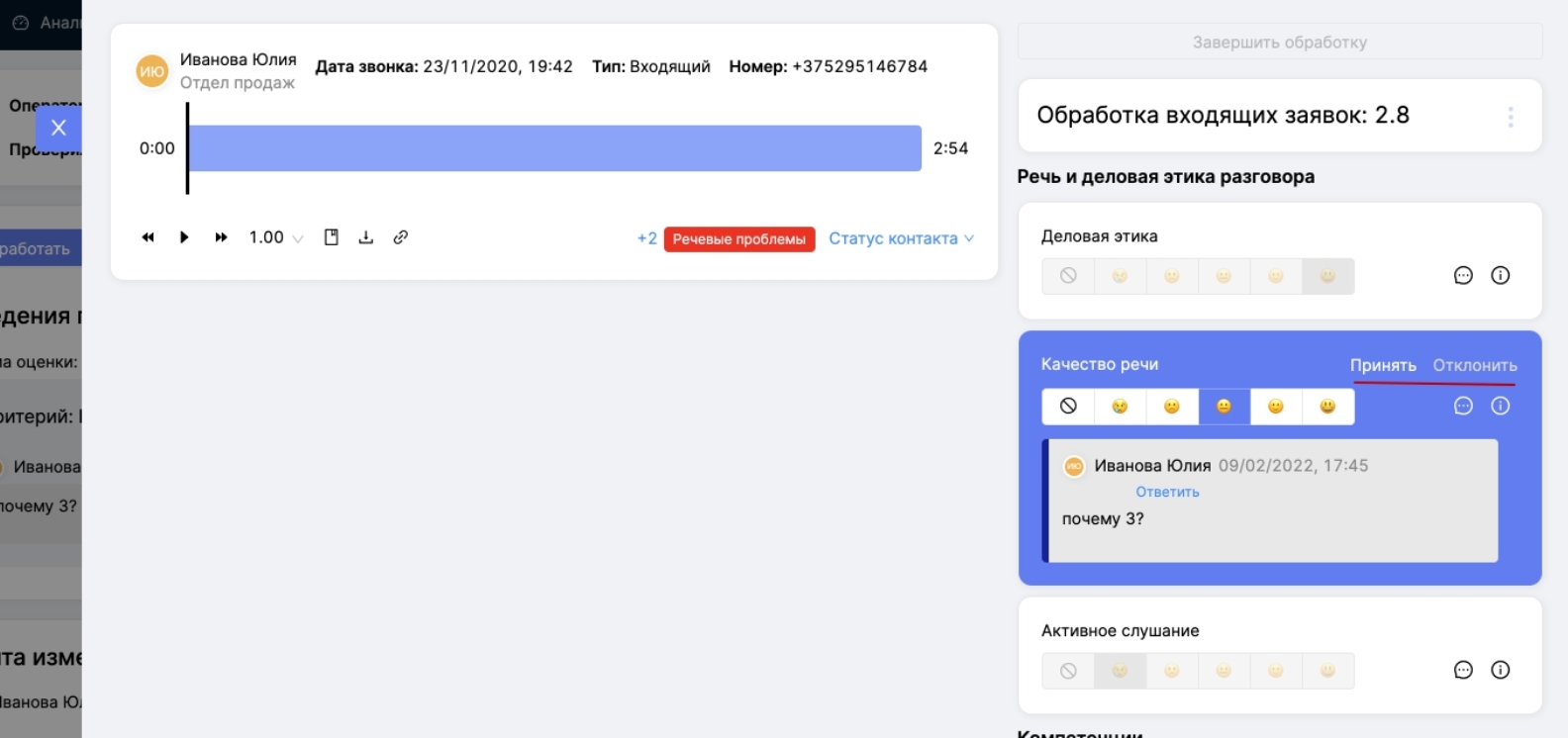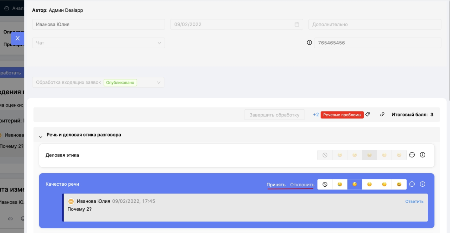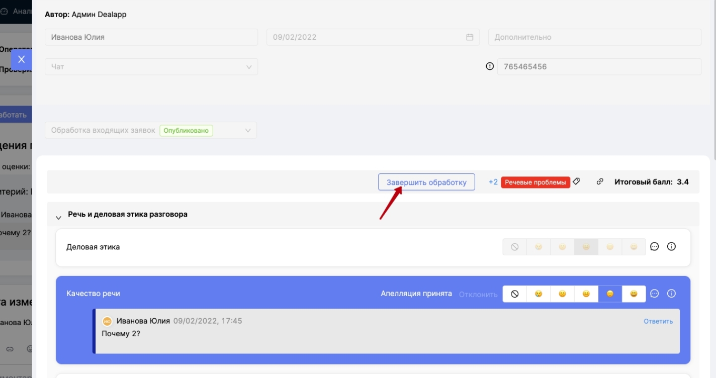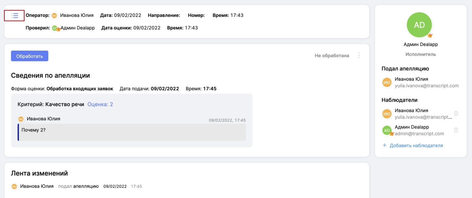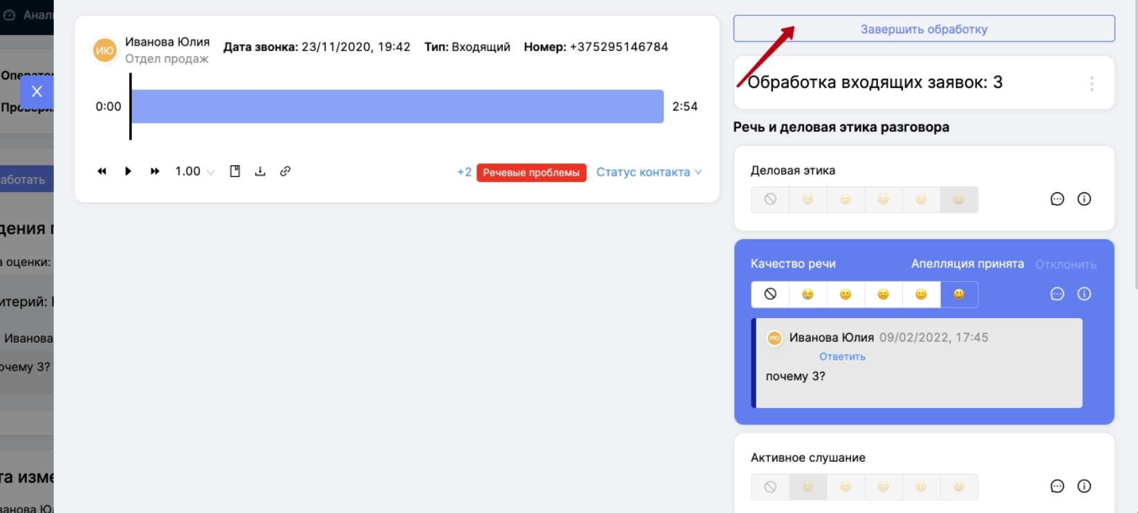 Ниже представлен интерфейс обработки апелляции, поданной на проверку звонка, а также на оценку, совершенную через функцию "Новая проверка". Механизм работы аналогичный, отличается только интерфейс коммуникации.