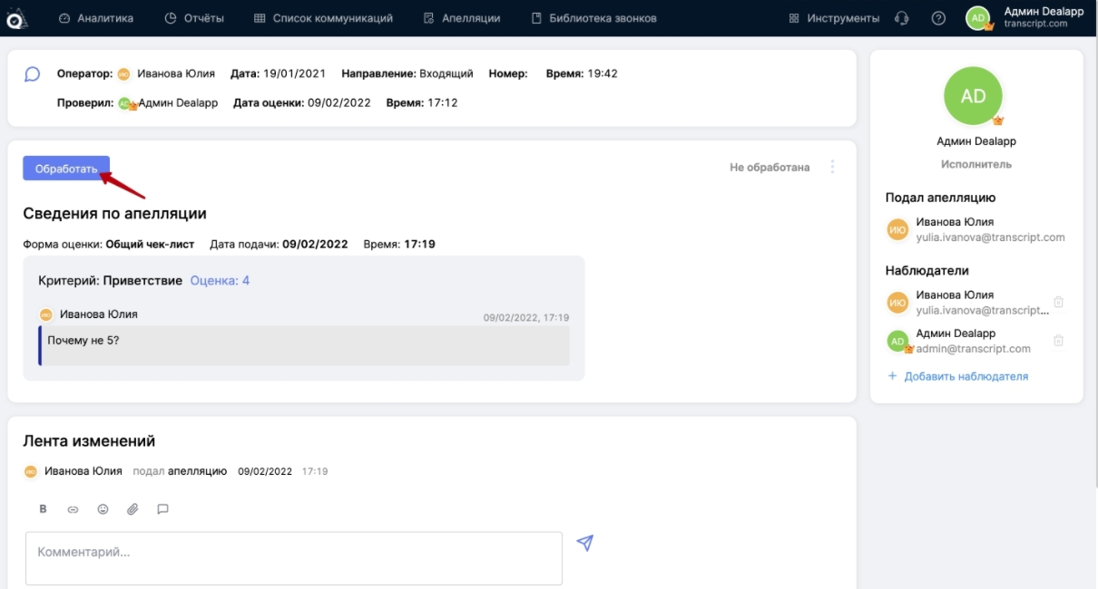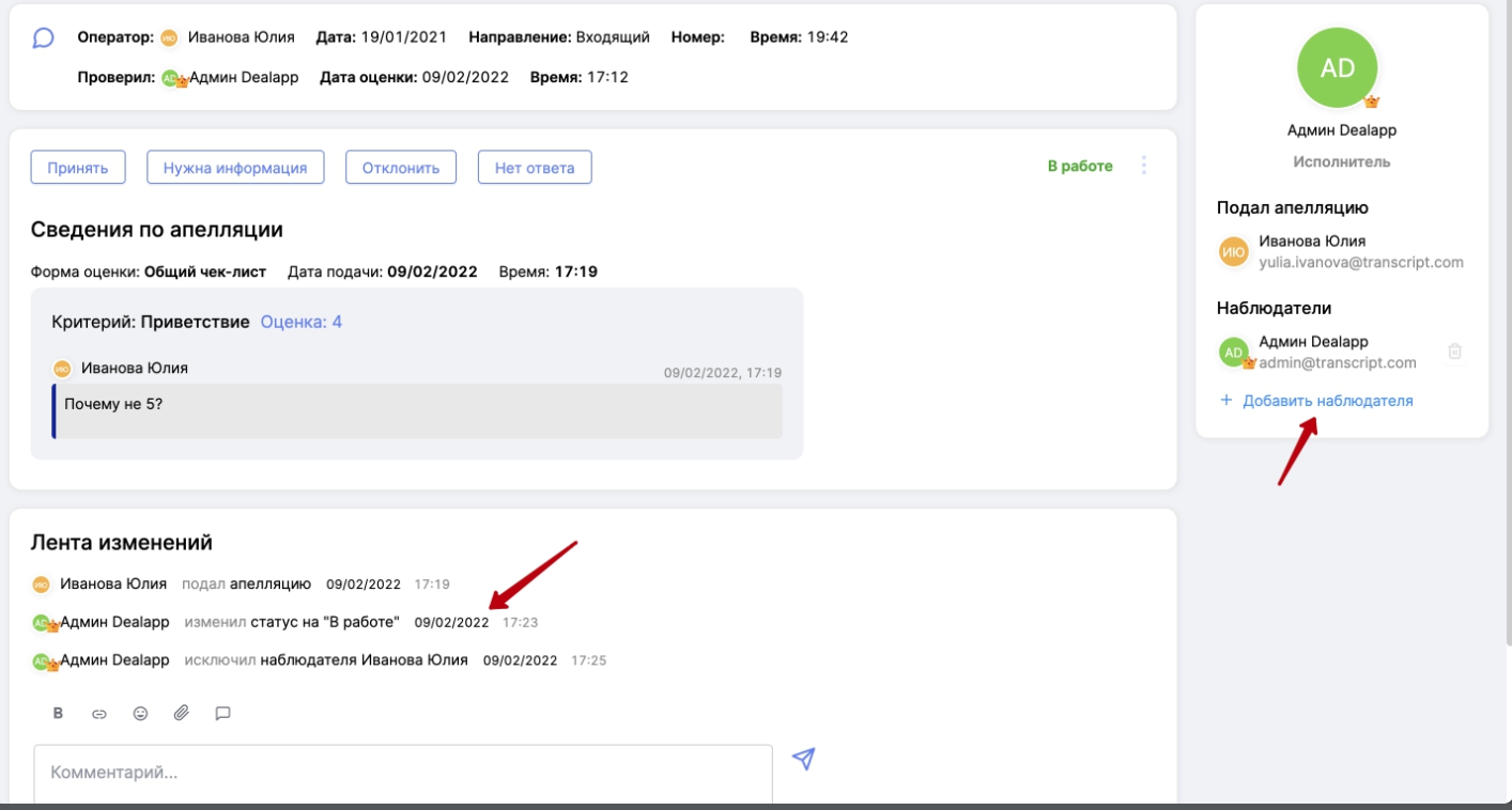 Обращаем внимание, что все действия будут зафиксированы в Ленте изменений. В этом месте вы и все участники апелляции смогут оставлять комментарии. Участники апелляции отображены справа. Вы можете удалить или добавить наблюдателя для апелляции.