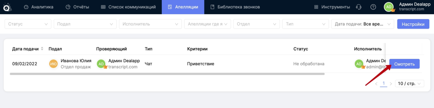 Для того, чтобы обработать апелляцию, перейдите на страницу Апелляции и нажмите на кнопку "Смотреть".