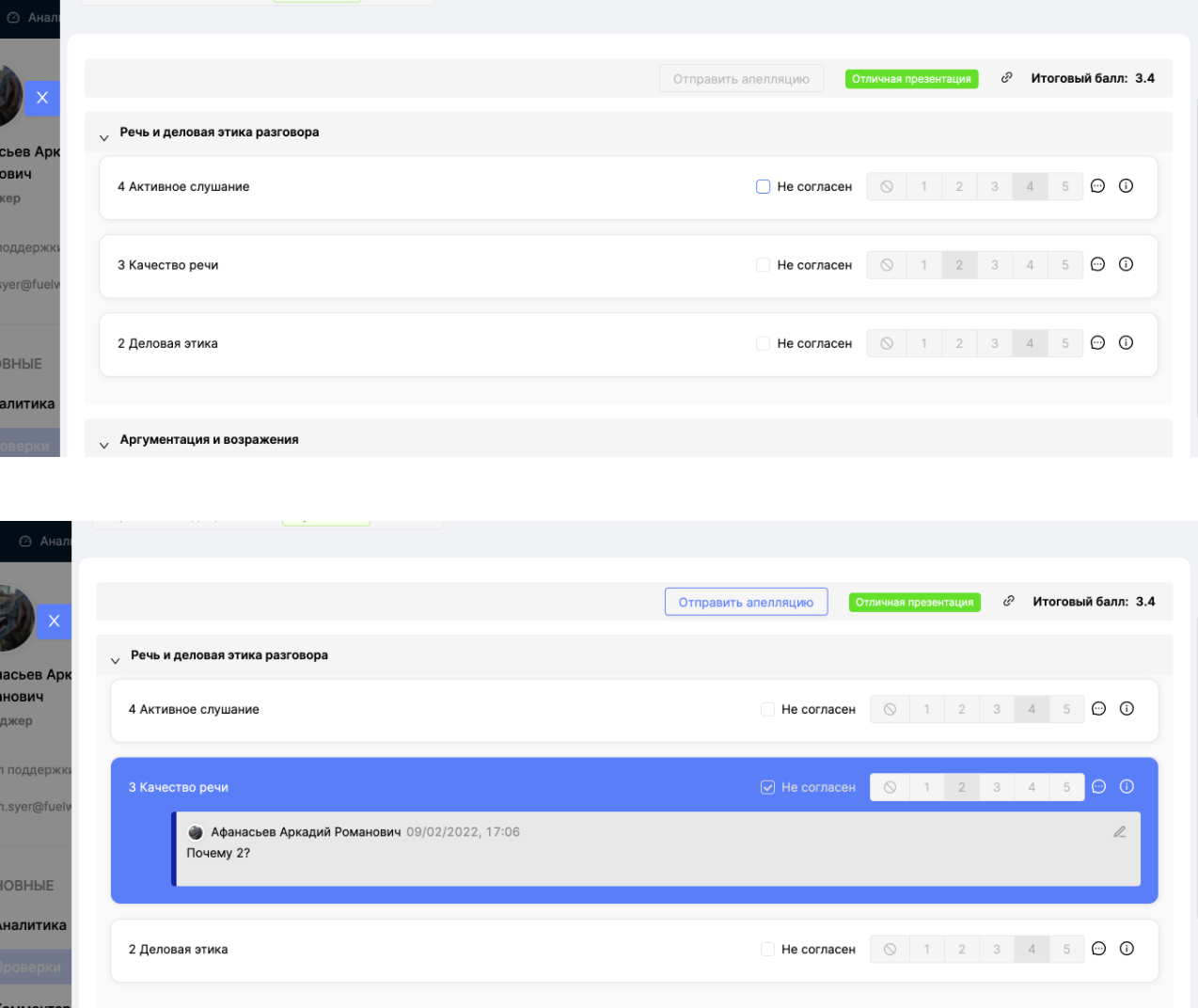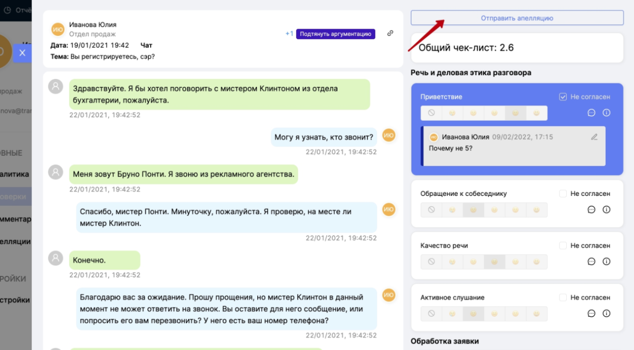 Для того, чтобы подать апелляцию на оценку текстовой коммуникации или оценку, совершённой через функцию "Новая проверка", нужно выполнить тот же набор действий. Ниже приведена демонстрация, как подать апелляцию на текстовую коммуникацию.