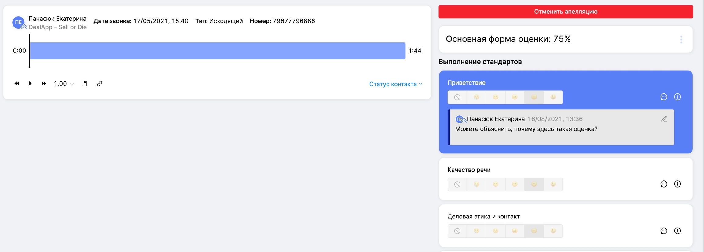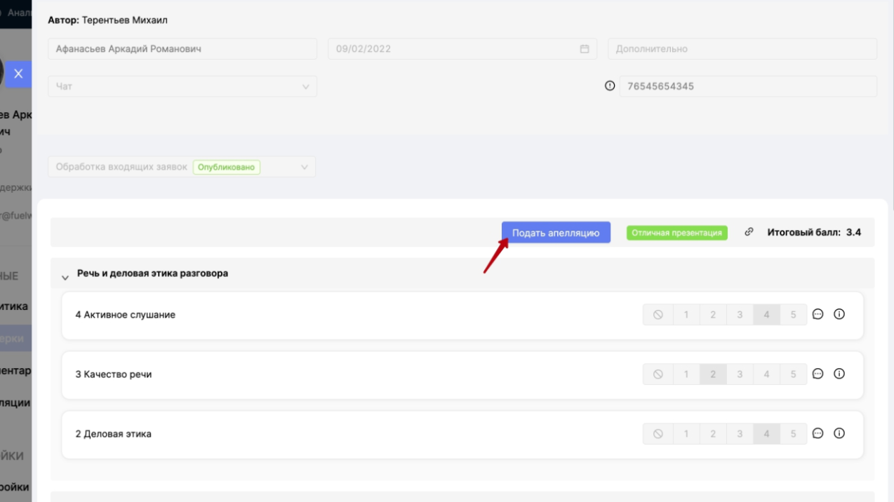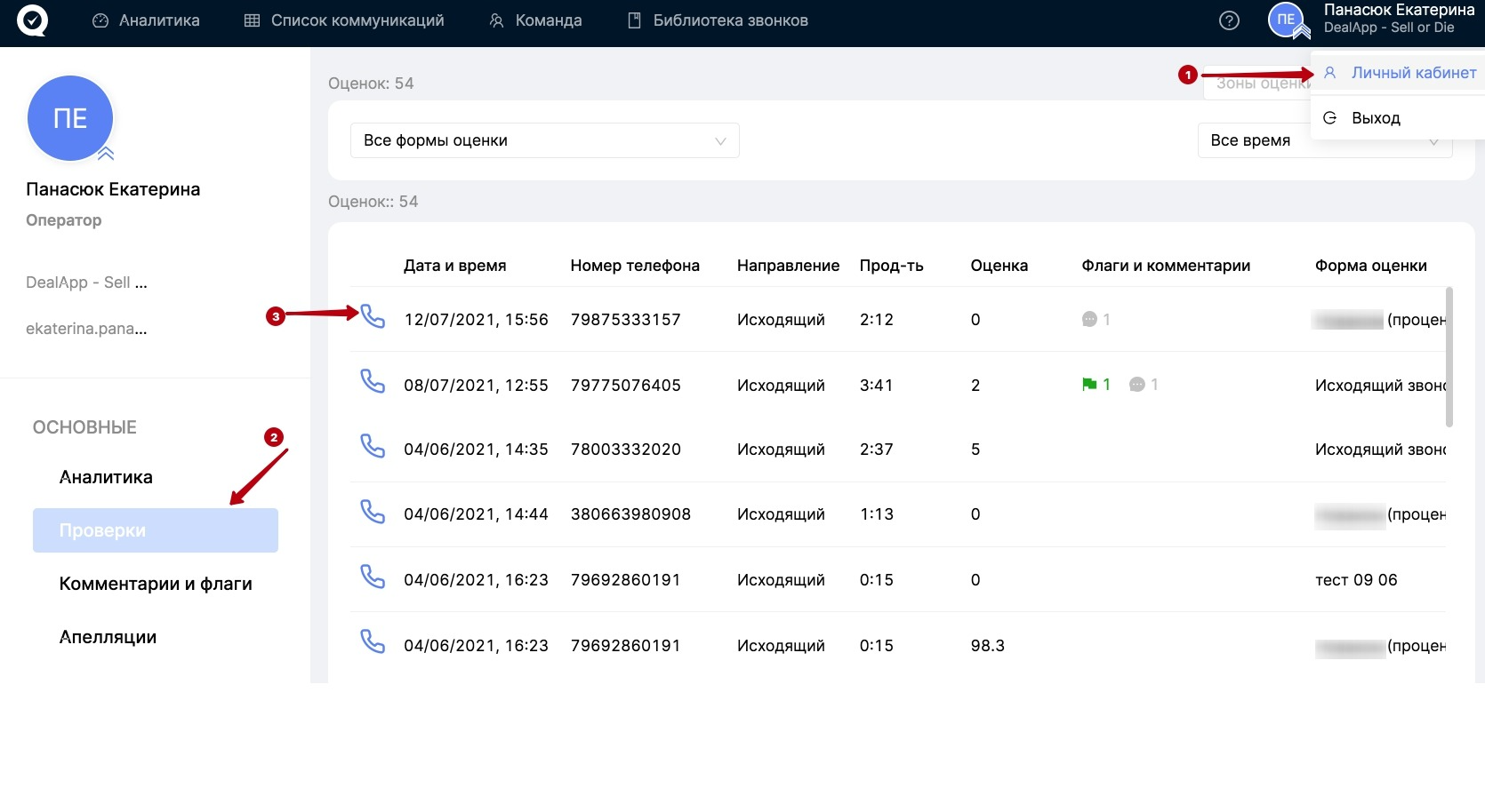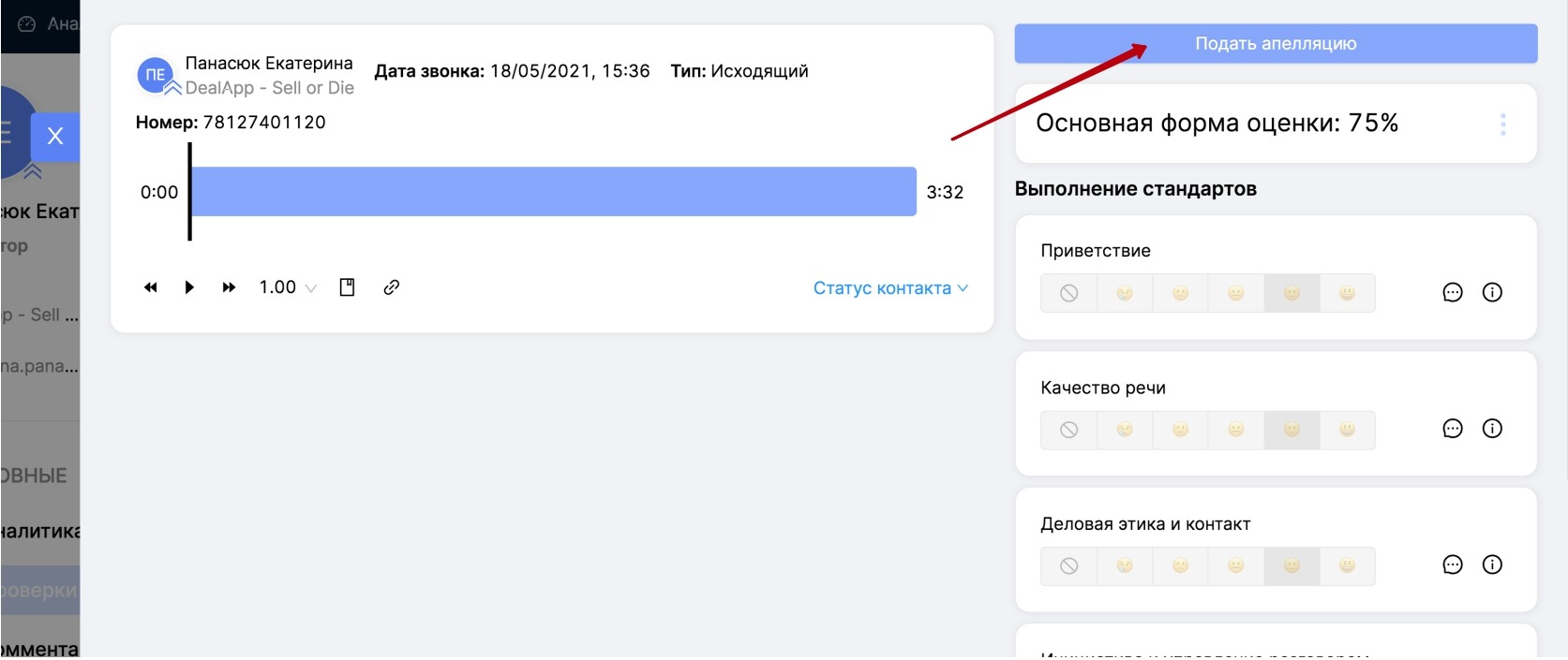 Для того, чтобы подать апелляцию на свою оценку, в личном кабинете на вкладке проверки выберите коммуникацию, оценку за которую вы хотите оспорить. Нажмите на иконку телефонной трубки.