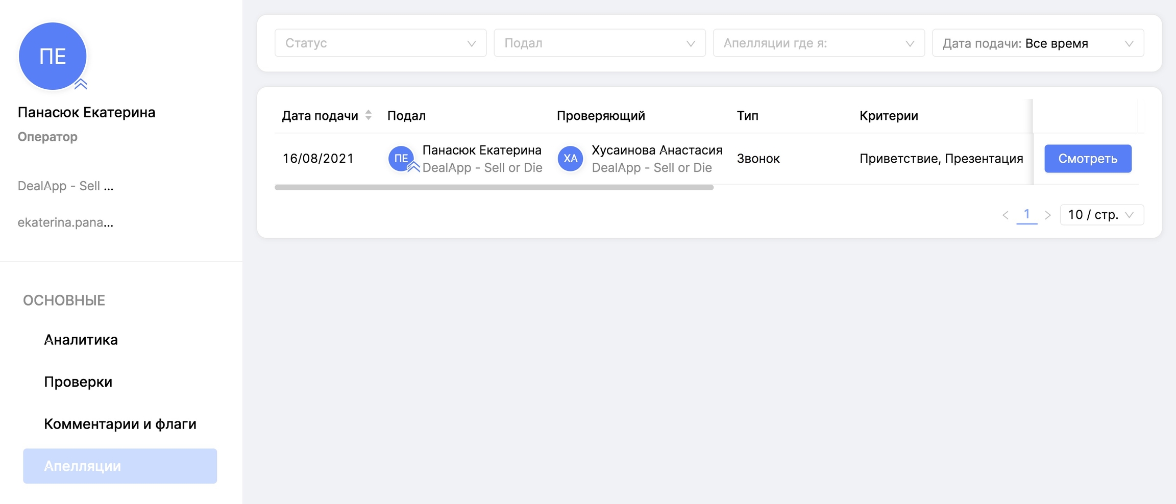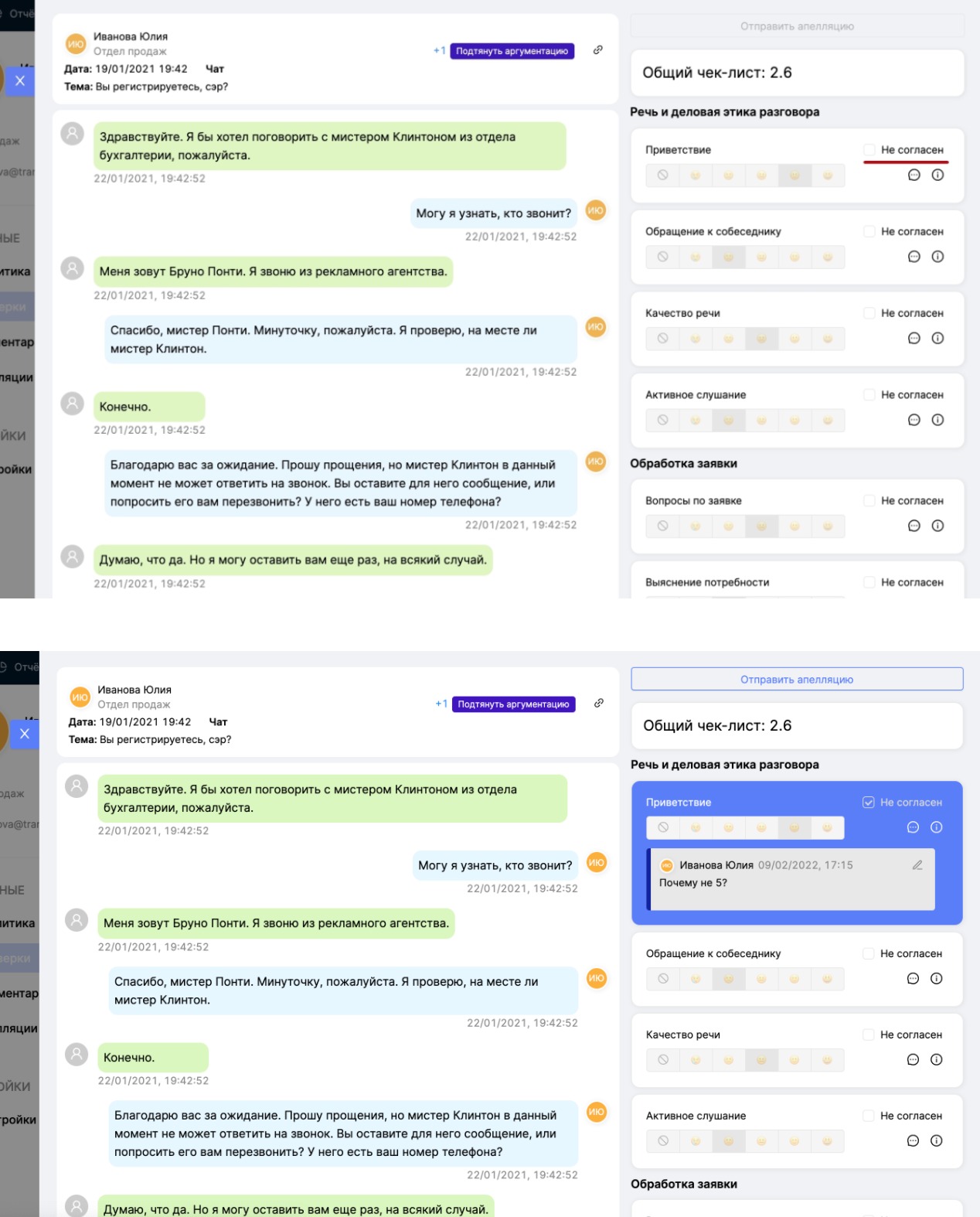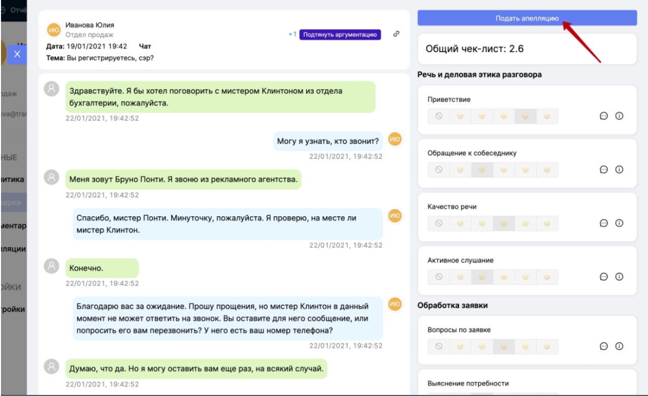 Для того, чтобы подать апелляцию на свою оценку, в личном кабинете на вкладке проверки выберите коммуникацию, оценку за которую вы хотите оспорить. Нажмите на иконку телефонной трубки.