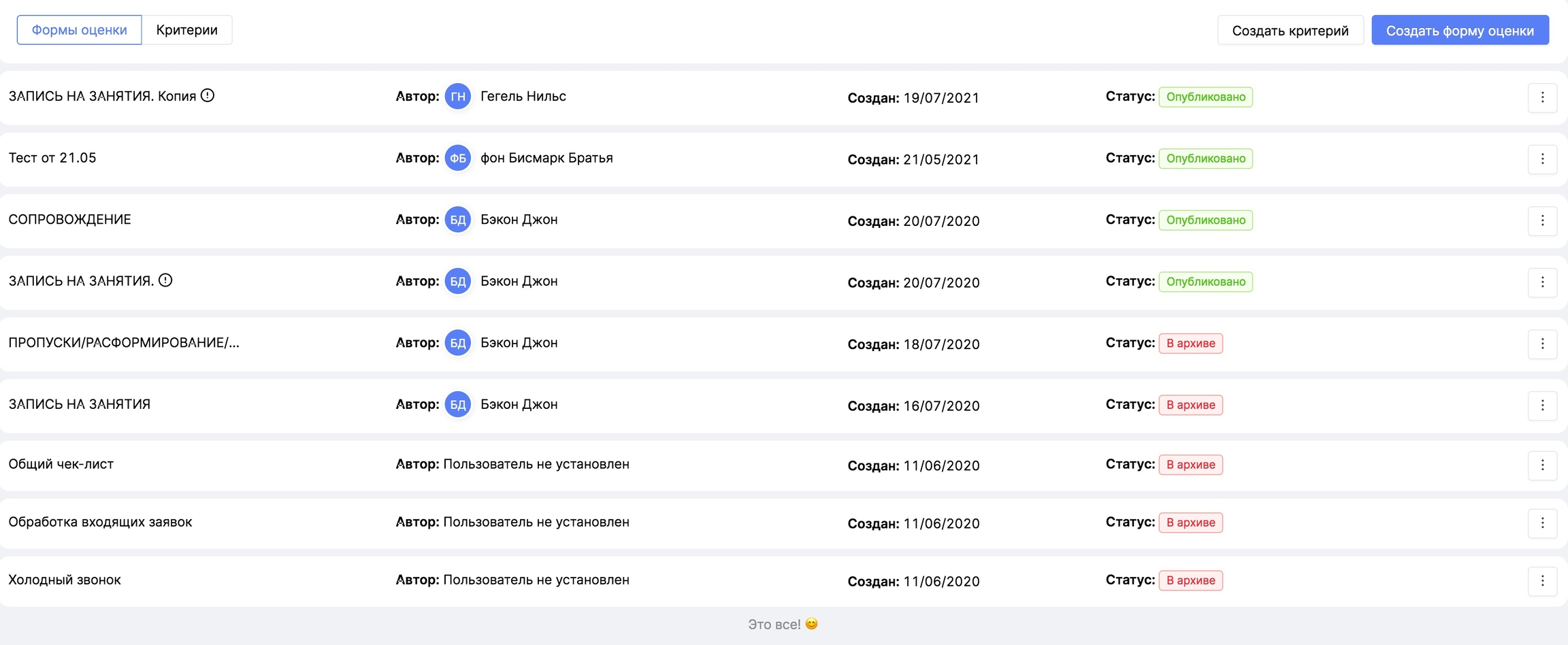 На главной странице находится список всех Форм оценки и отображается статус по каждому из них.
