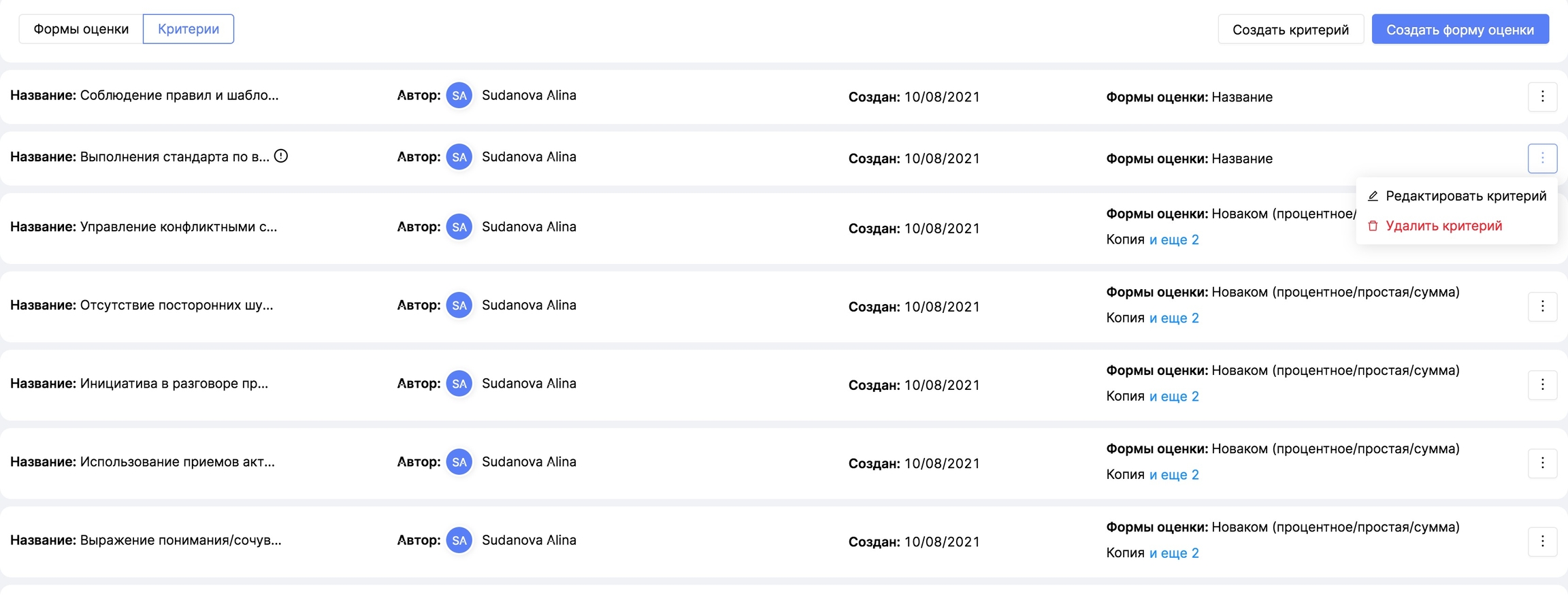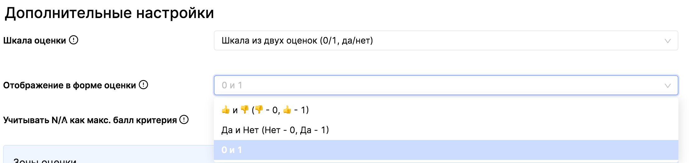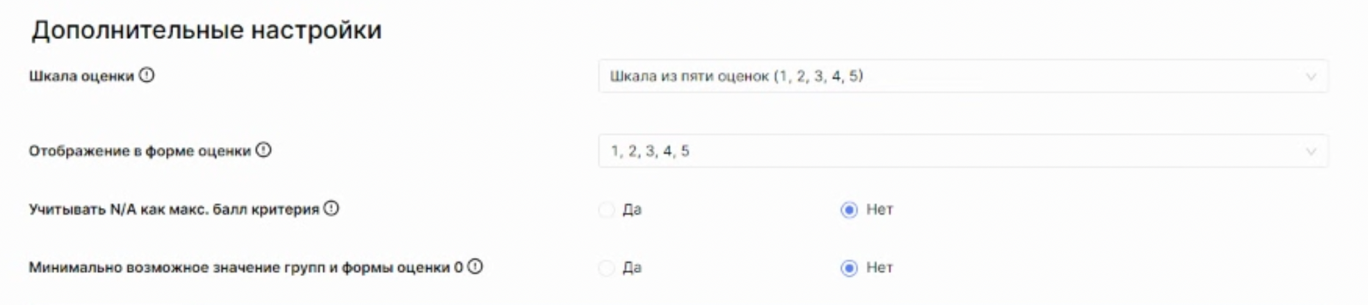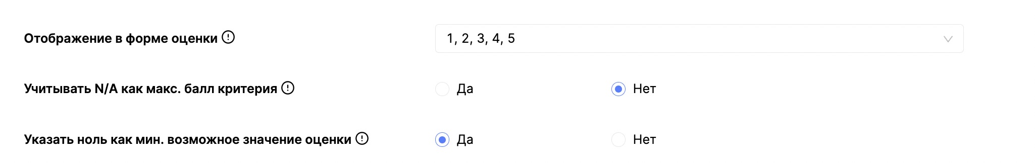 Расчет оценки - при Сумме баллов, система автоматически складывает оценки по всем критериям. При Среднем, система делит сумму набранных баллов на количество критериев.