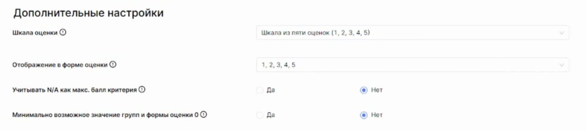 В пункте Шкала оценки можно выбрать то, с каким количеством баллов по умолчанию будут добавлять вопросы в форму оценки.