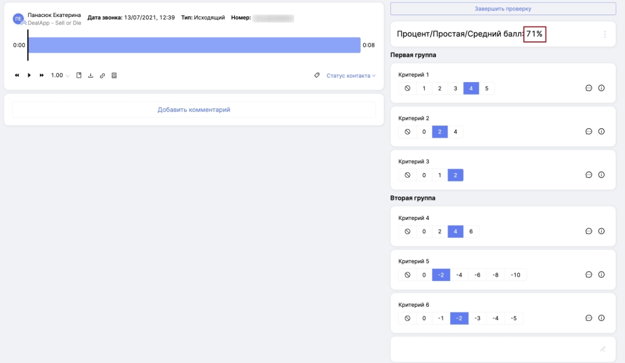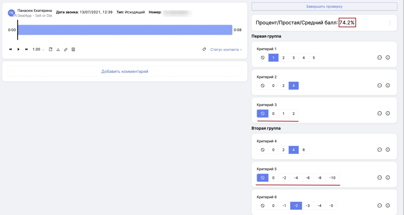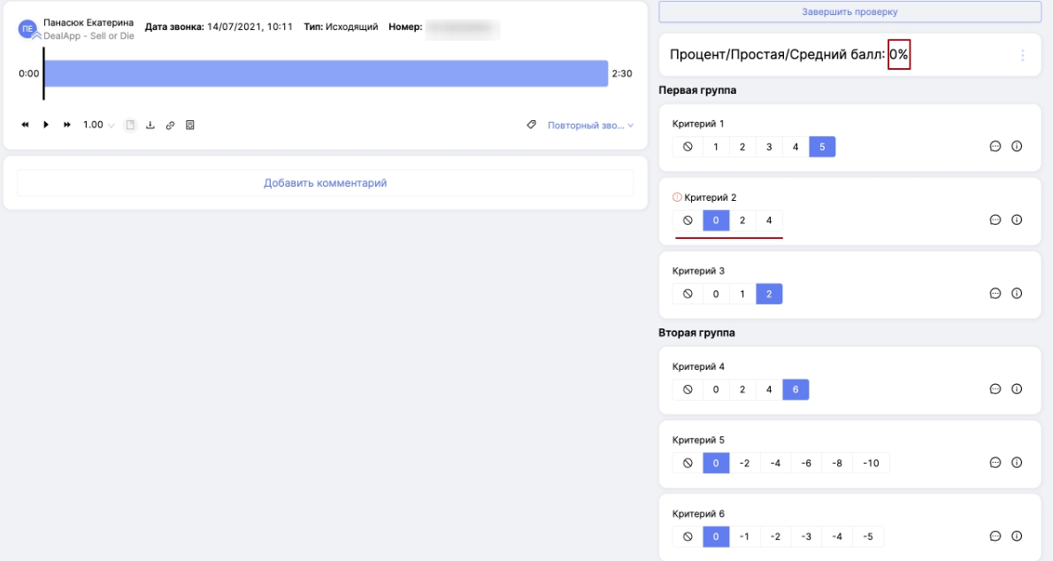 4. Обратим внимание также на ситуацию, когда вы не используете доп. настройки (автофейл, учет N/A как макс. значения), но во время оценки пропускаете оценку каких-либо критериев.