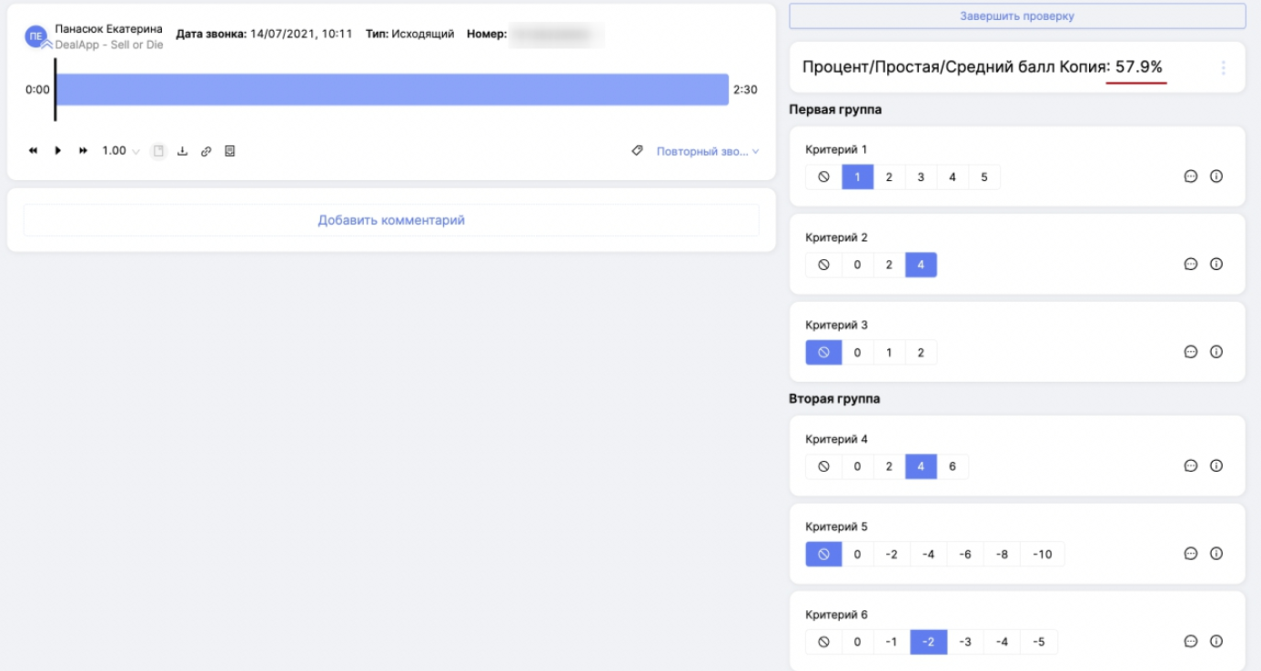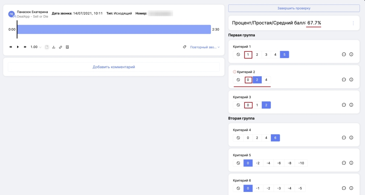 Рассмотрим, как будет считаться результат при наличии автофейла. Если во время оценки вы выбираете не задействованные в автофейле значения, то все будет считаться так, как будто этого автофейла и нет. Но если вы выберите пункт ответа, который настроен на автофейл, вы увидите предупреждение о сработавшем автофейле и сможете сразу завершить оценку. При желании, вы можете продолжить оценивать коммуникацию.