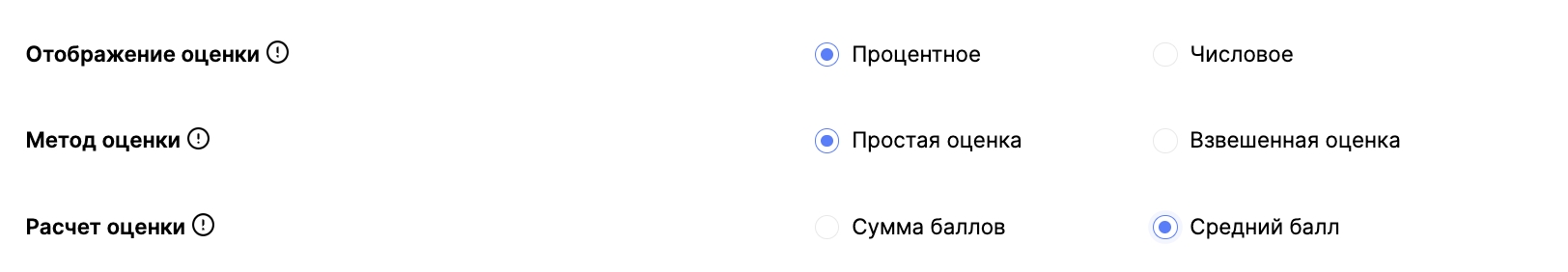 💡 Для того, чтобы наглядно увидеть, как работает подсчет, можно изучить лист "Процентная_Простая_Средний балл" в этом файле. Далее в статье мы подробнее рассмотрим классические и особые настройки форм оценки для данного формата подсчета.