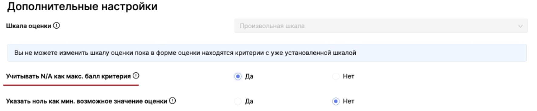 1. Если в настройке формы оценки дополнительно отметить пункт "Учитывать N/A как макс. балл критерия" как "Да":