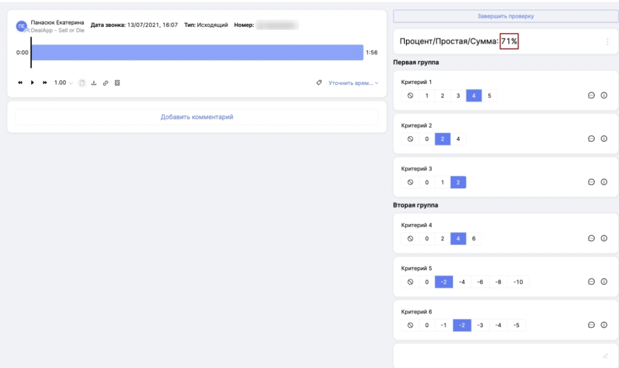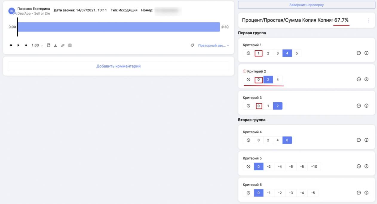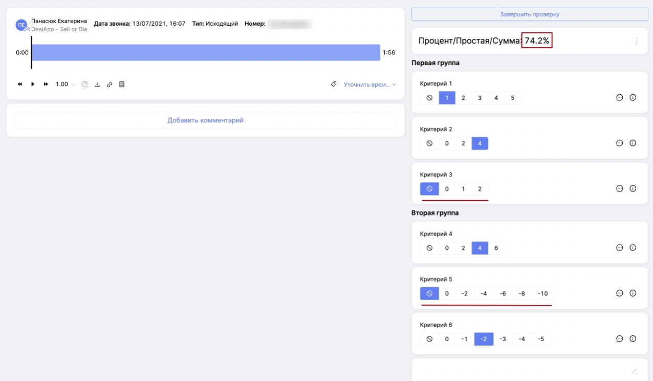 Рассмотрим, как будет считаться результат при наличии автофейла. Если во время оценки вы выбираете не задействованные в автофейле значения, то все будет считаться так, как будто этого автофейла и нет. Но если вы выберите пункт ответа, который настроен на автофейл, вы увидите предупреждение о сработавшем автофейле и сможете сразу завершить оценку. При желании, вы можете продолжить оценивать коммуникацию.