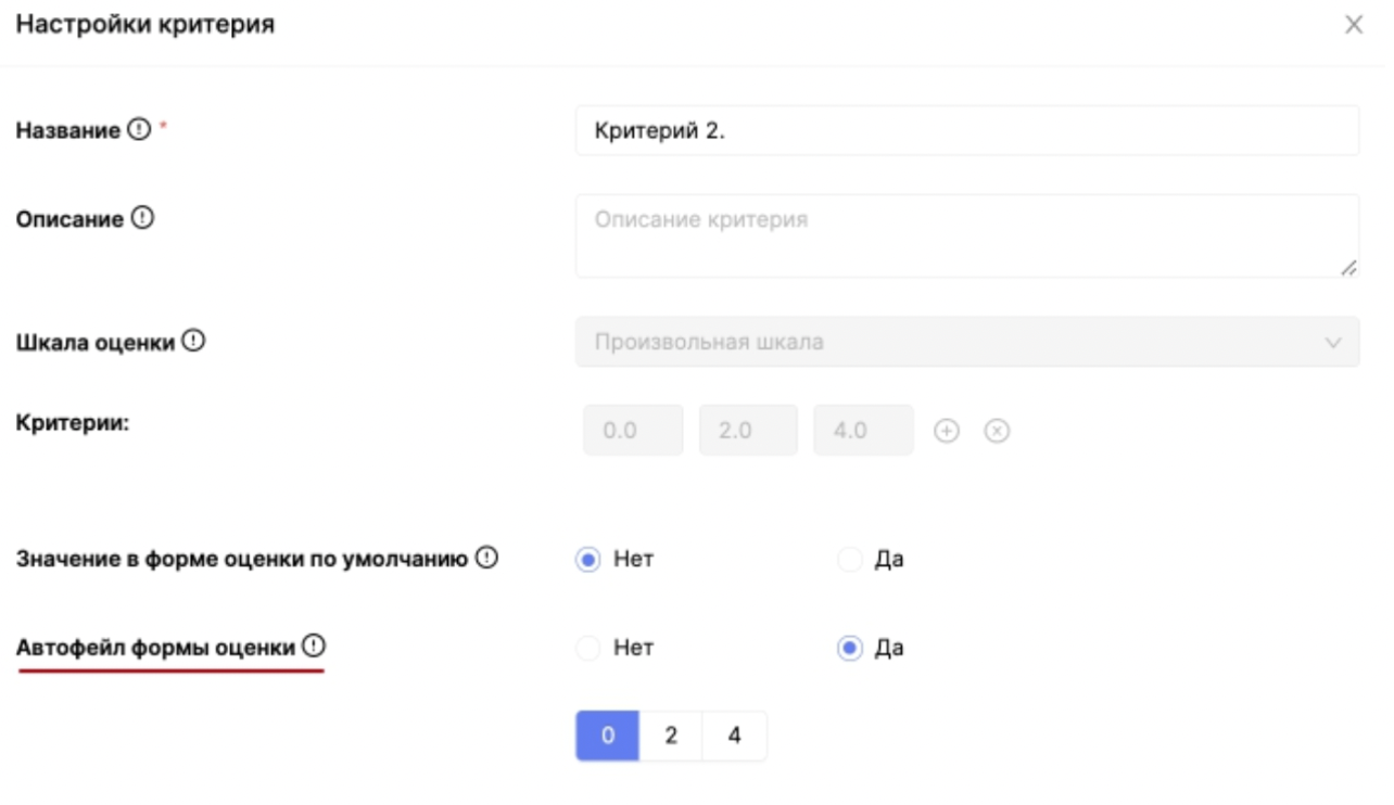 2. В настройках каждого критерия можно задать автофейл, т.е. обнуление всей группы. В случае срабатывания такого автофейла, оценка по всей группе будет минимальной из возможных.