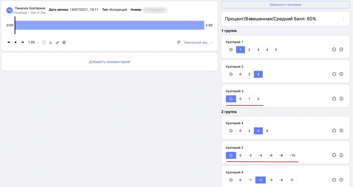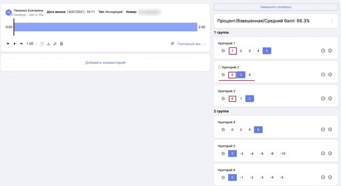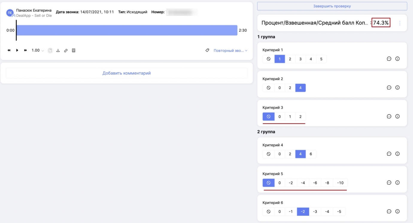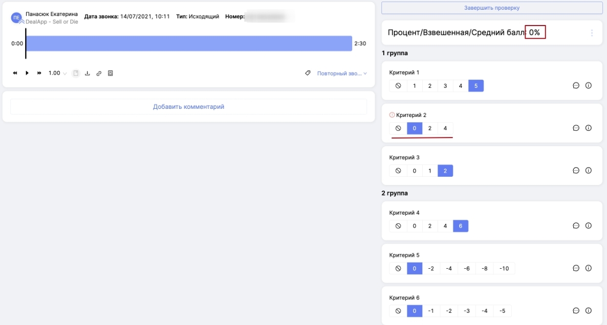 Рассмотрим, как будет считаться результат при наличии автофейла. Если во время оценки вы выбираете не задействованные в автофейле значения, то все будет считаться так, как будто этого автофейла и нет. Но если вы выберите пункт ответа, который настроен на автофейл, вы увидите предупреждение о сработавшем автофейле и сможете сразу завершить оценку. При желании, вы можете продолжить оценивать коммуникацию.