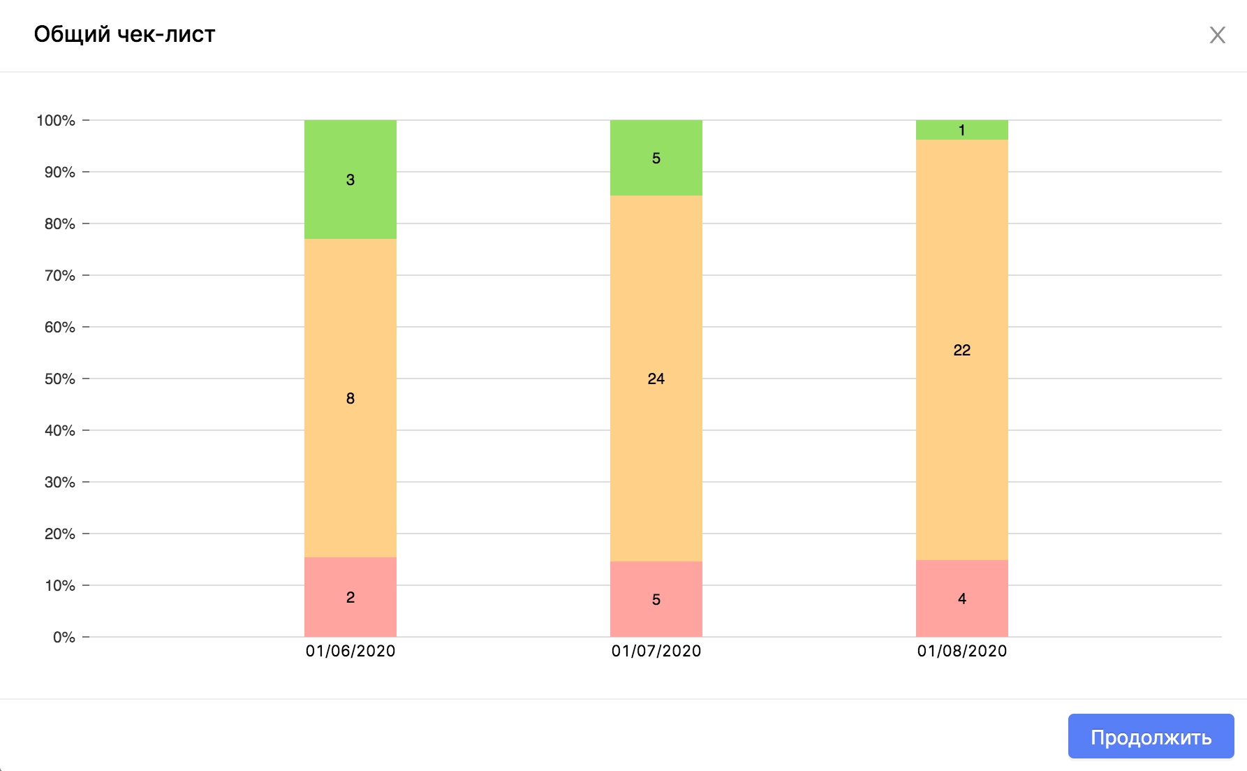 Всего было сделано 74 проверки. Критерий "Приветствие" попадал в красную зону (получал низкую оценку) 15 раз, в желтую и зеленую соответственно - 38 и 21 раз. В сумме получается кол-во проверок (15+38+21=74). Серым цветом обозначены проверки, в которых данный критерий не учитывался.