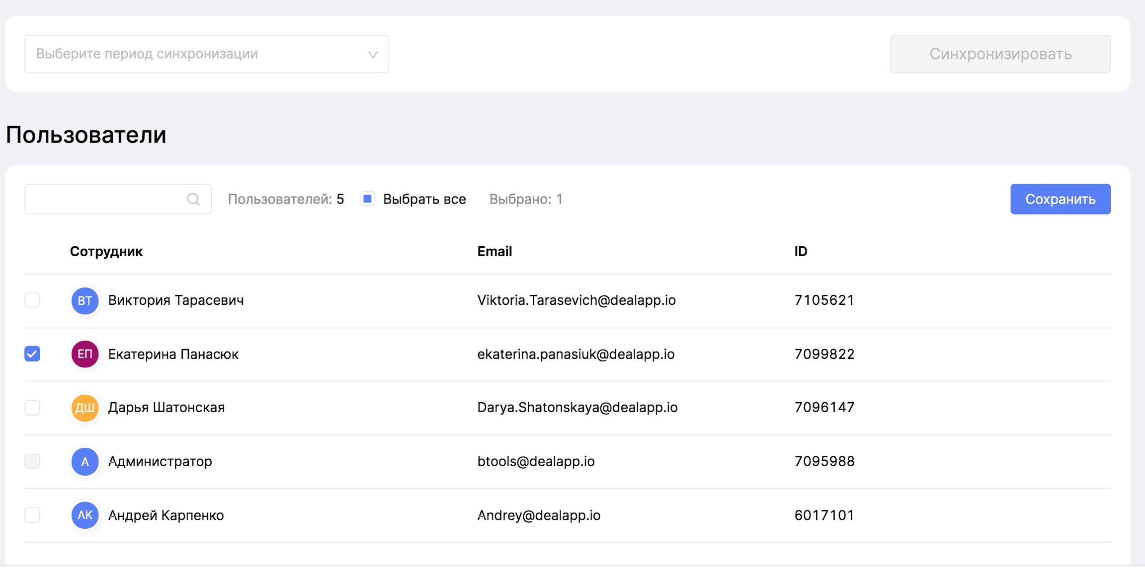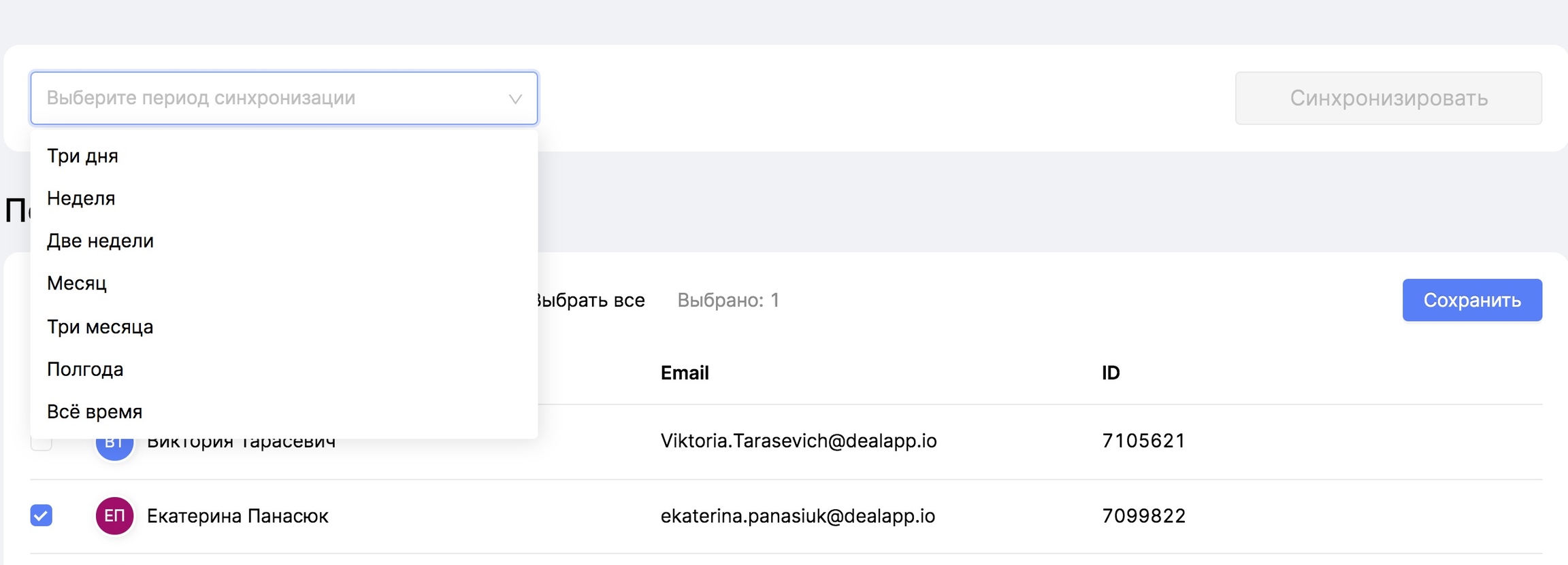 Если вы не нашли нужных пользователей в списке аккаунтов, запустите синхронизацию за три дня. Новые сотрудники через несколько минут попадут на эту страницу, и вы сможете их отметить.