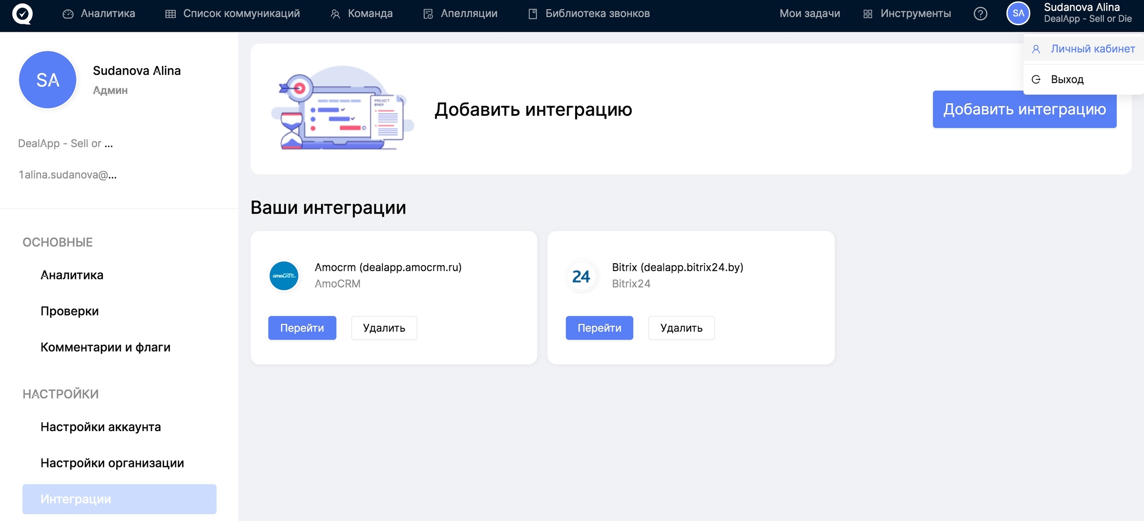 Для того, чтобы добавить нового сотрудника, перейдите в Личный кабинет -> Интеграции и перейдите в интеграцию с той системой, куда был добавлен новый сотрудник.