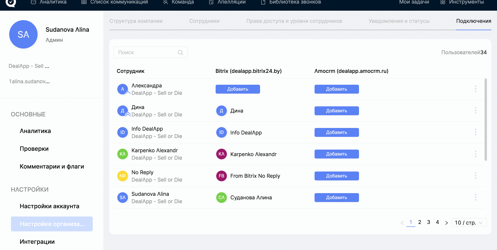 Увидеть список всех аккаунтов конкретной интеграции можно, если на вкладке Интеграции перейти в нужную вам интеграцию. Там вы увидите список аккаунтов, которые импортировались из СRM или телефонии/чат или тикет-системы. Если какого-то сотрудника нет на странице Подключения, то нужно перейти в нужную вам интеграцию на странице Интеграции и проверить с помощью поиска, что аккаунт отмечен галочкой. Если нет - отметить его и нажать на Сохранить. В Qolio автоматически сгенерируется пользователь и подключится к данному аккаунту.